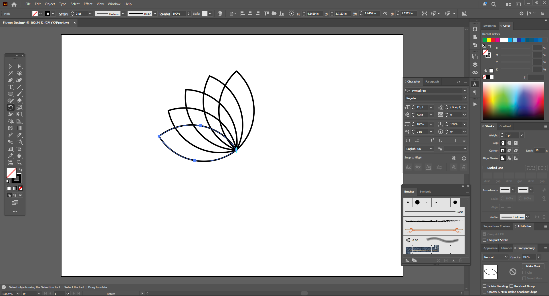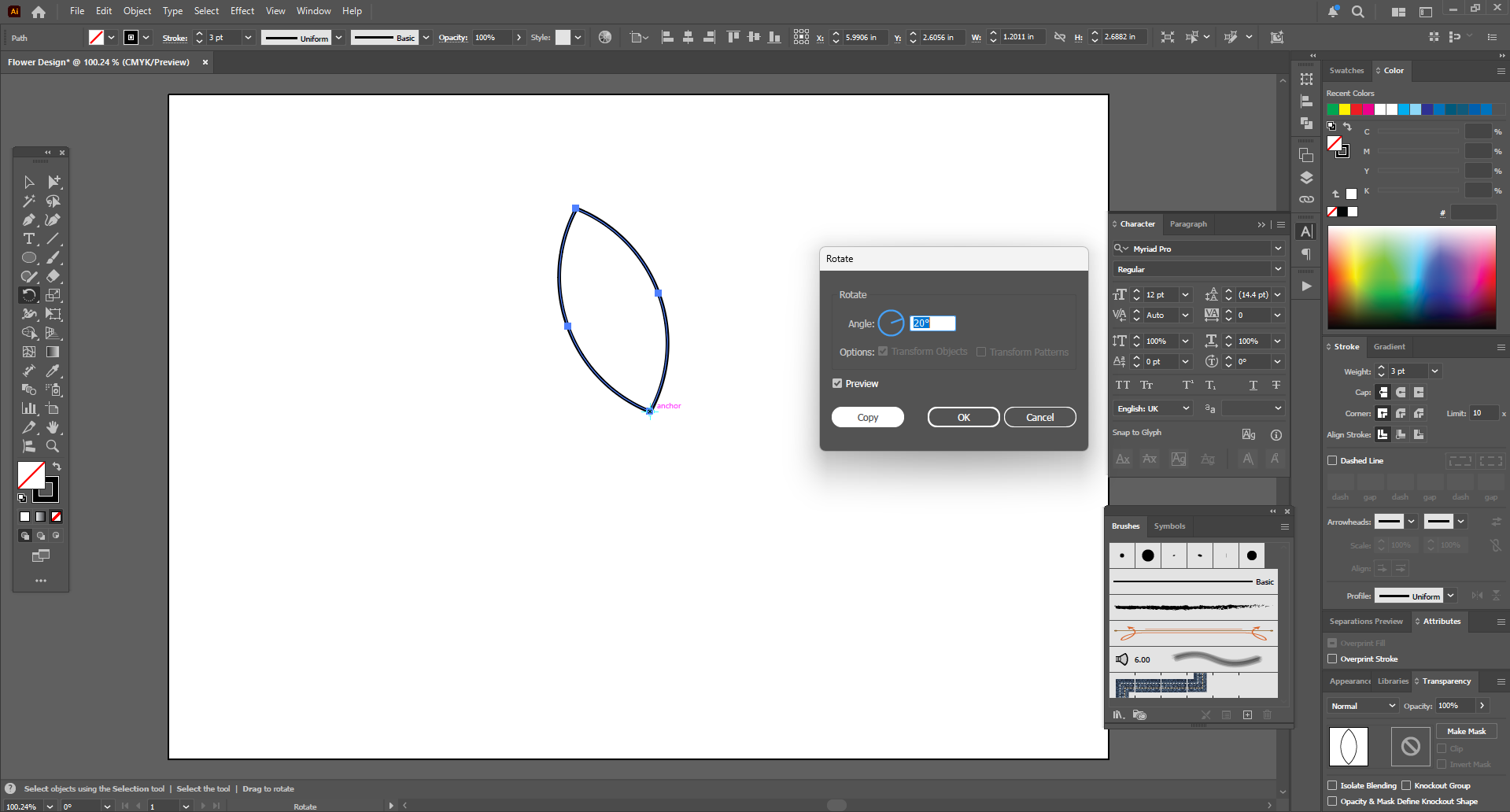 Then I ungrouped here and deleted the top object and kept the bottom object. Then it looked like a leaf. I used the Rotate tool to rotate this shape by clicking on the bottom anchor. Then from there I pressed Control D on the keyboard with a 20 degree angle. Then they started copying and pasting at a 20 degree angle.