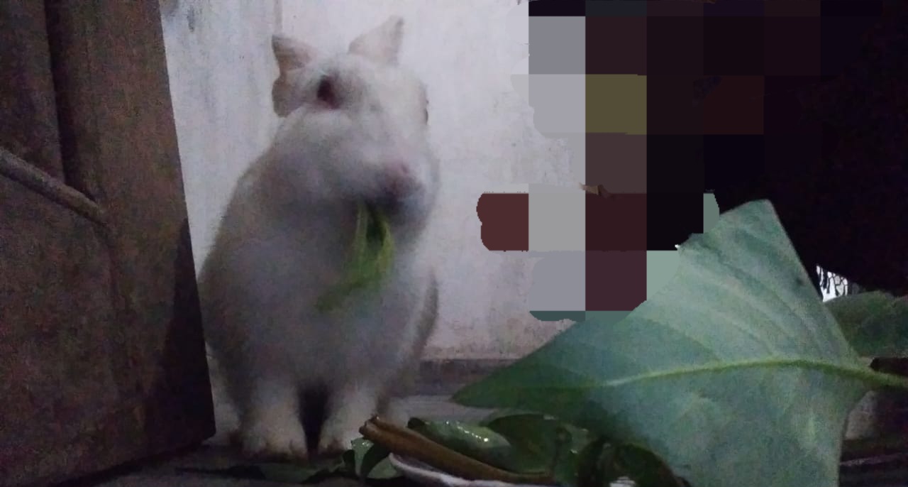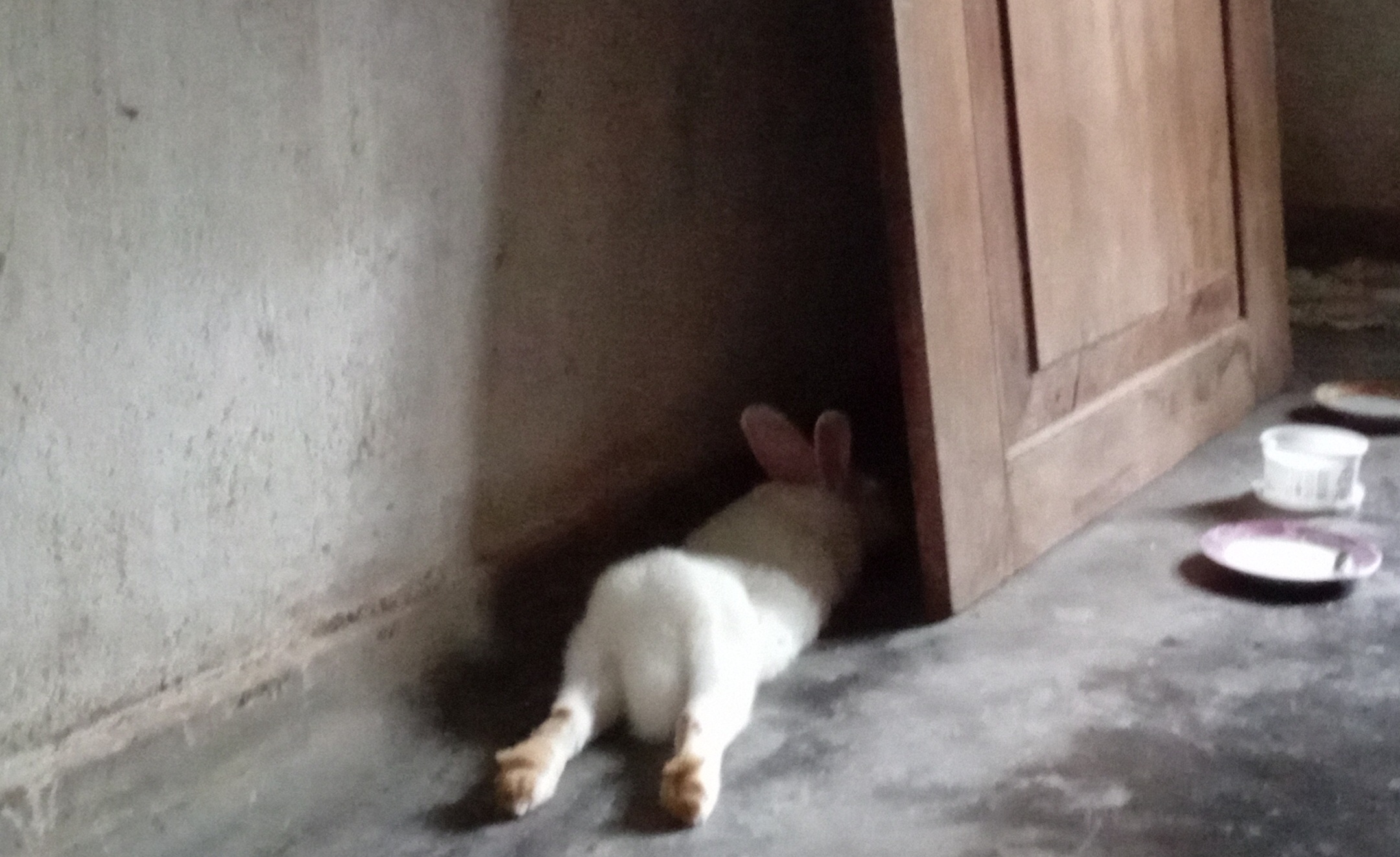 The room was also empty, so we kept the rabbit there for a few days. It was my first time being so close to a rabbit, and I called him "Rabbitty Rabbit." My cousin sister also lives there, so it was a good time for her too. We both took care of his food and went to a place near our home to bring him leaves.