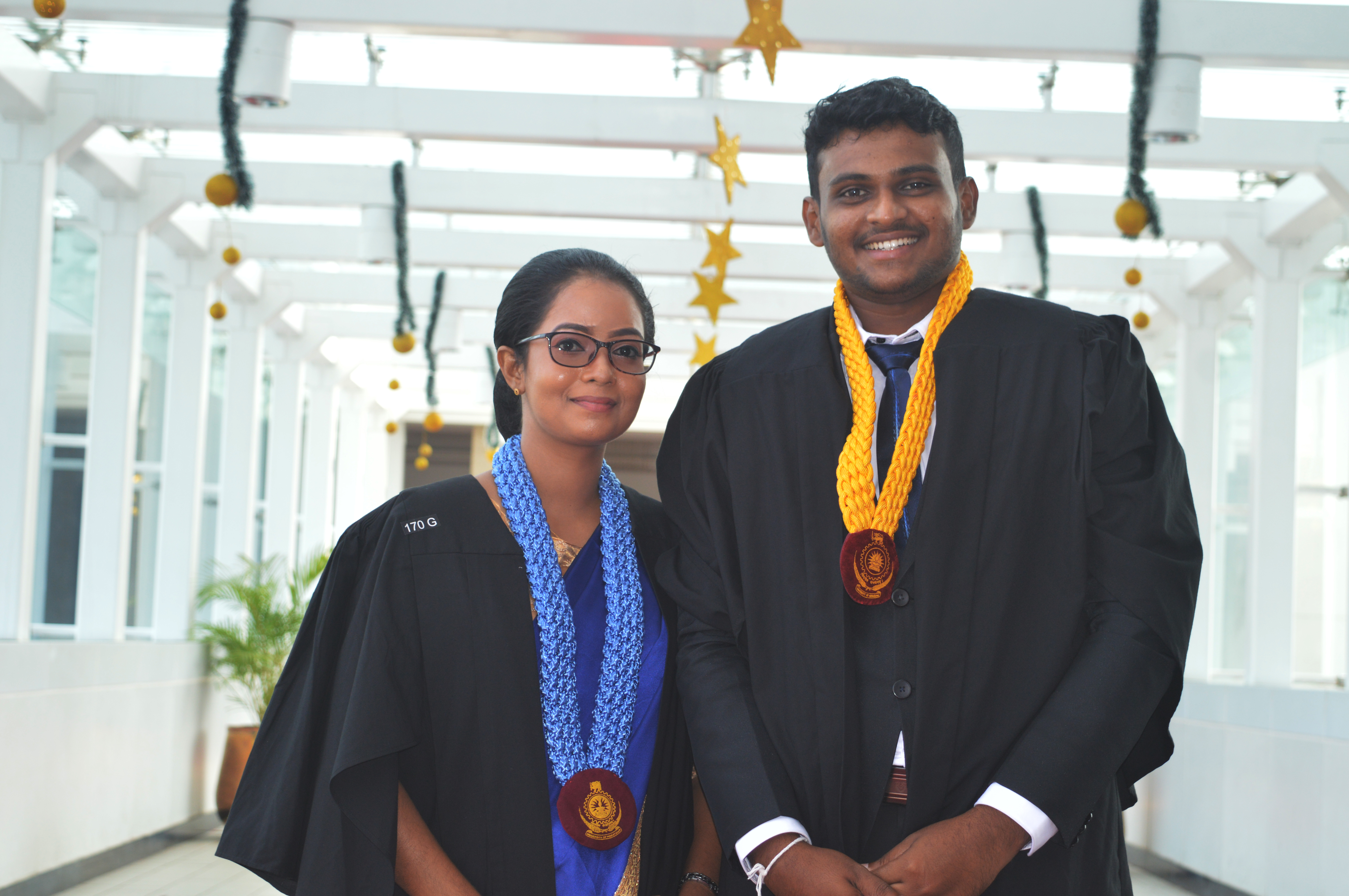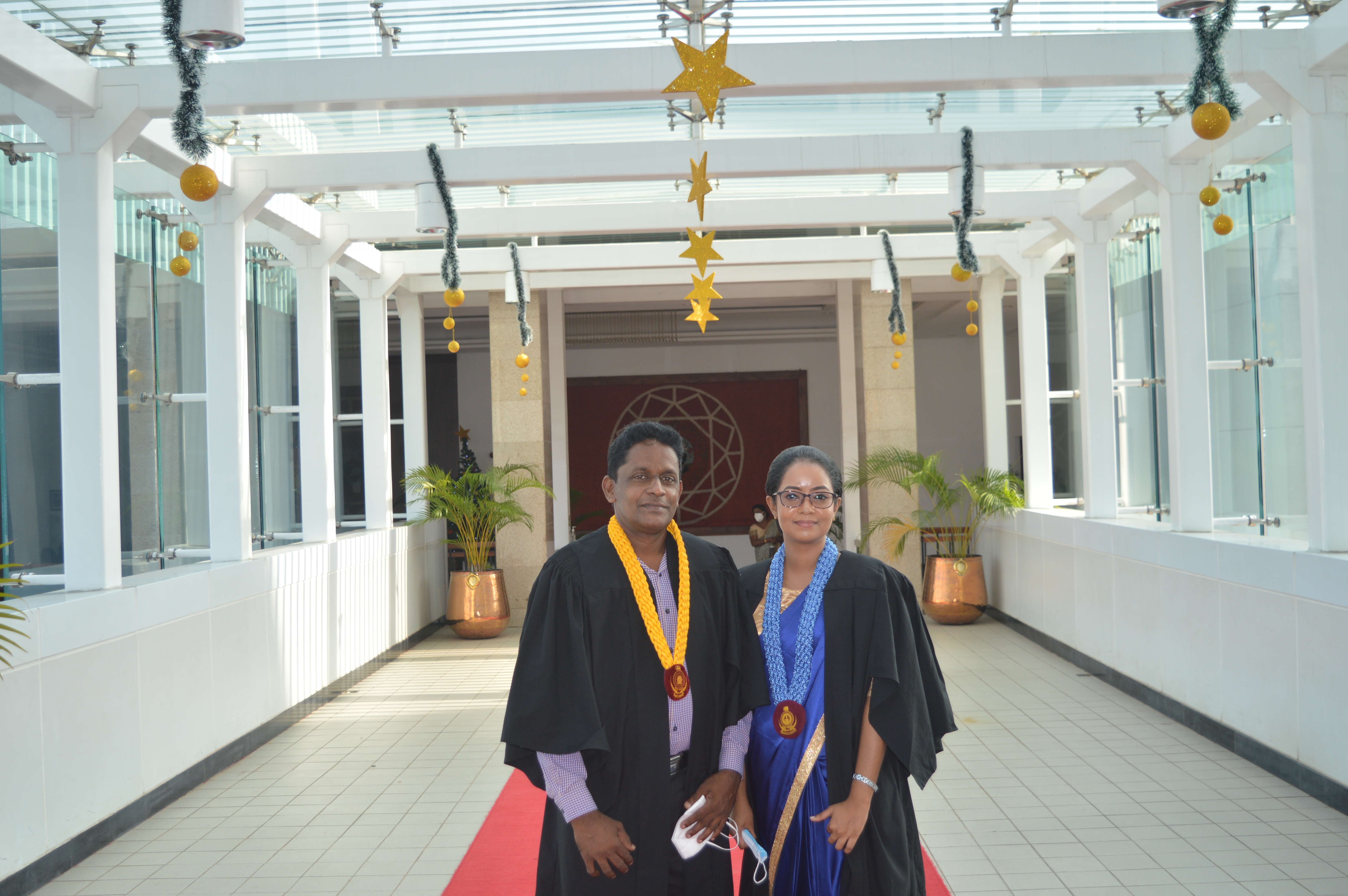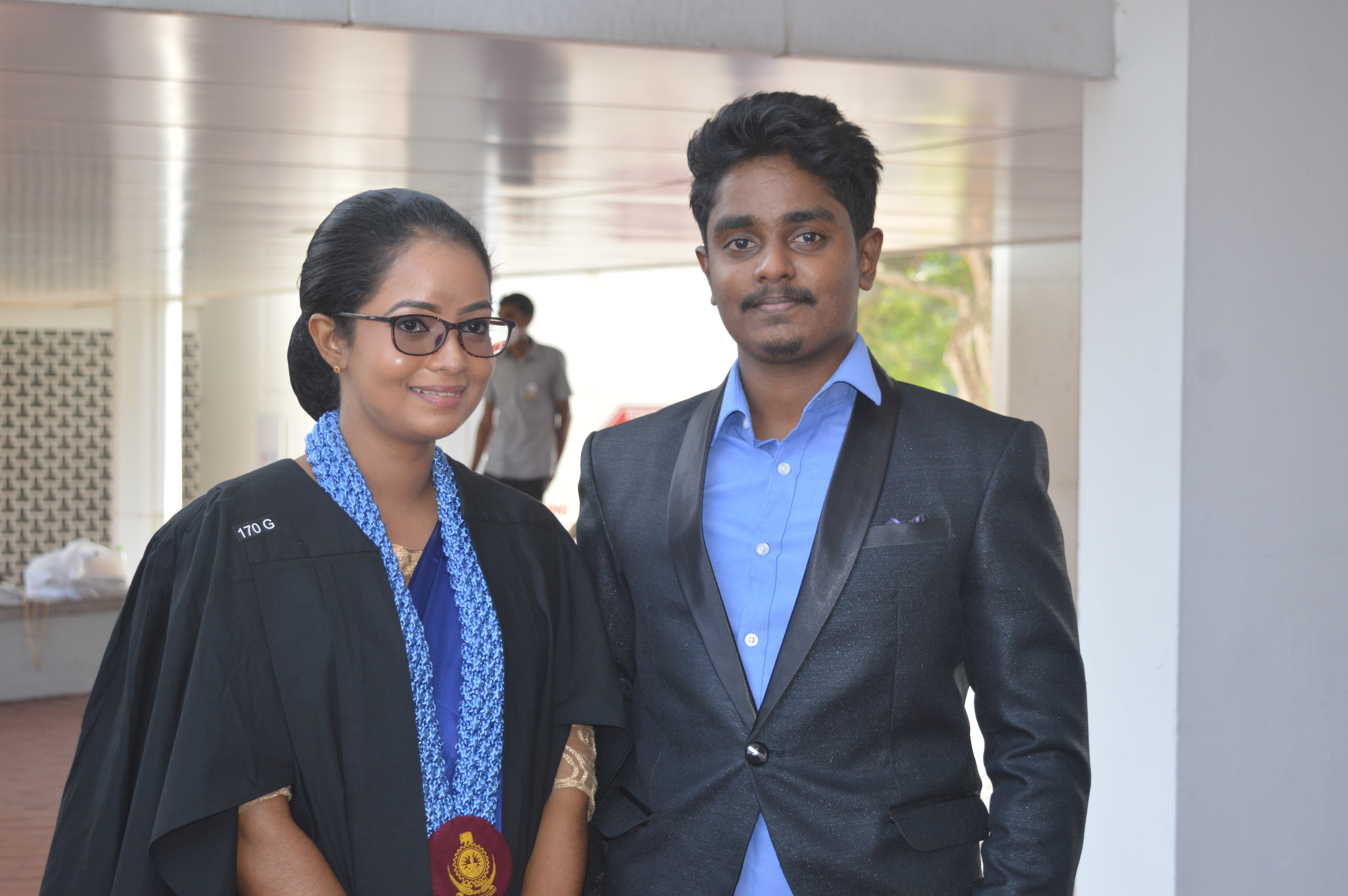 දවසෙ තිබ්බ තවත් වැදගත්ම Photo එකක් තමයි මේ උඩ තියෙන්නෙ. එයා Civil මම IT. එයාට තිබුණ කහ පාට මාලයක්, මට තිබුණේ නිල් පාට මාලයක්. එයාට convocation තිබුනෙ 22, මට තිබුණෙ 23. ඒ වුණාට ජීවිත කාලෙටම මතක හිටින මේ දවස වෙනුවෙන් එයත් දවසම වෙන් කරා.