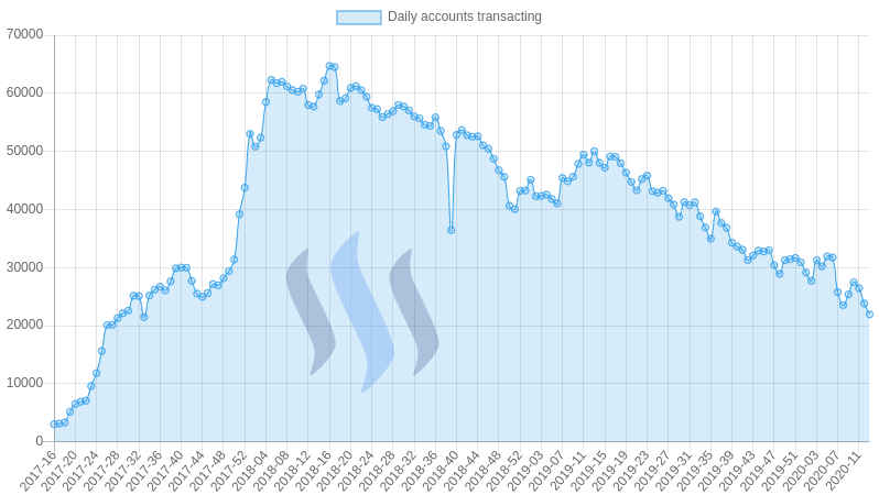 A 'transacting account' is a Steem account that made at least one transaction on the Steem blockchain. This can be a vote, post, comment, transfer, power up or SBD conversion. Users who only read from the Steem blockchain without interacting are not included. The actual number of 'Active users' is therefore much higher than the accounts transacting.