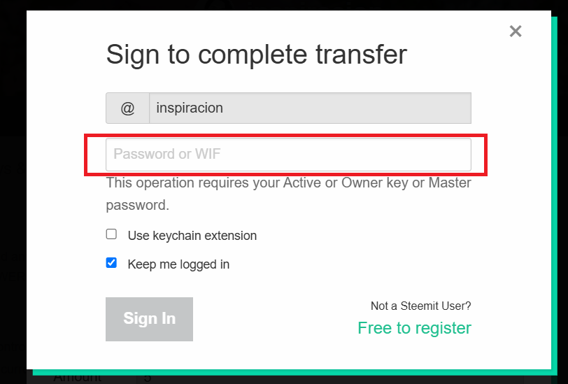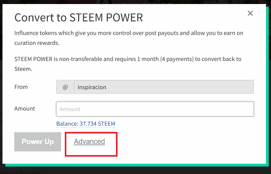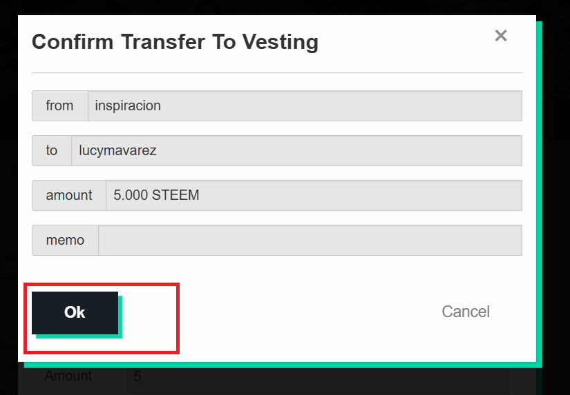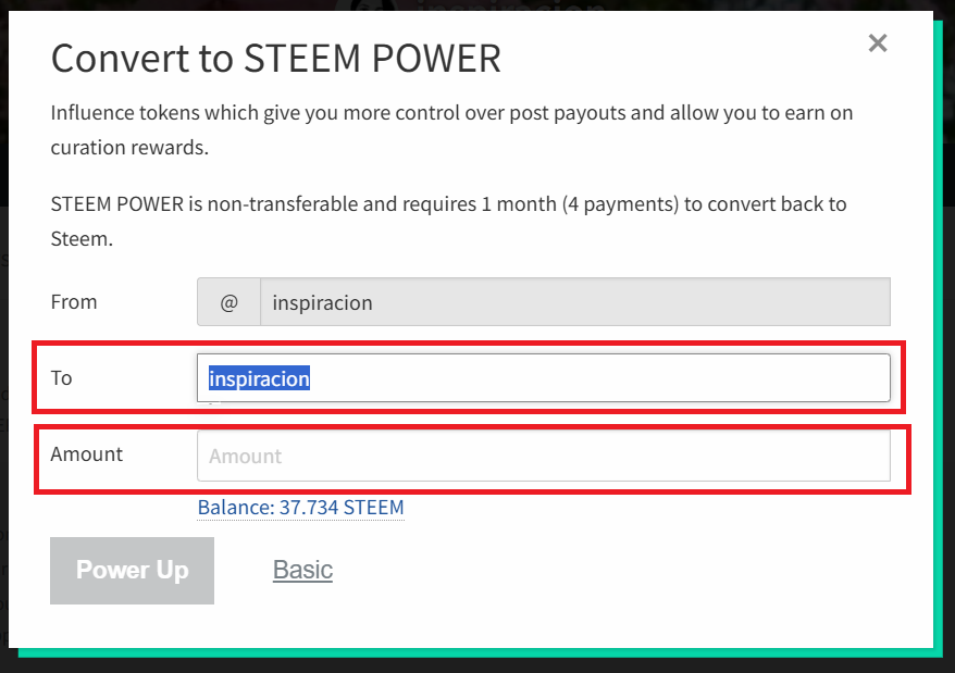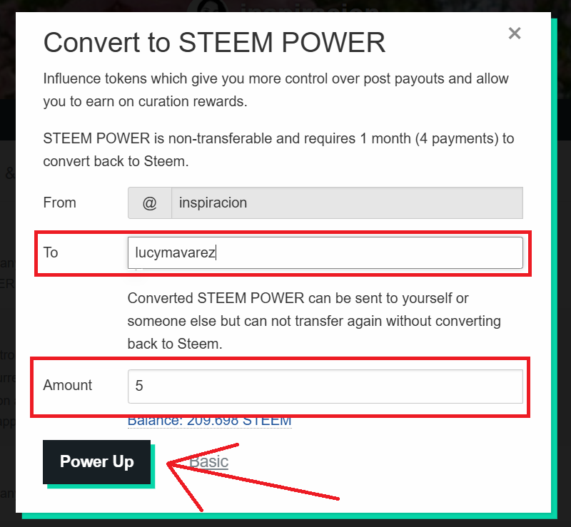Al hacer clic nos aparecerá la siguiente ventana, en la que debemos editar nuestro usuario, en mi caso aparece inspiracion, allí debo colocar el nombre de usuario al que quiero enviar el Steem Power.