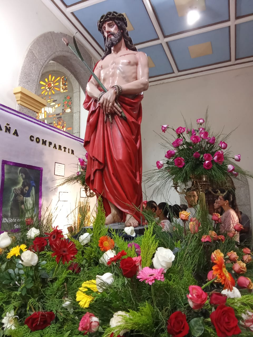 En la iglesia, los Santos estaban hermosamente decorados con flores. El Ecce Homo estaba en la entrada.