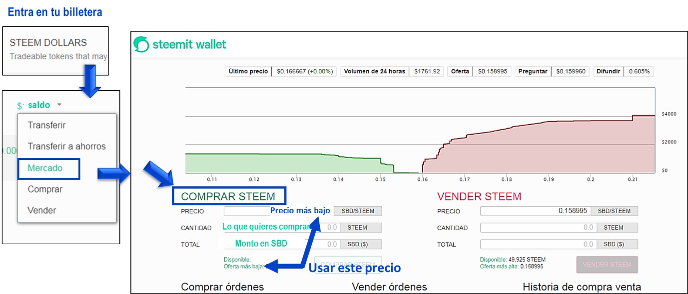 Lo primero que debes hacer es verificar si tienes algunos Steem para hacer el Power Up, si puedes también puedes comprar algunos adicionales, según la siguiente imagen: