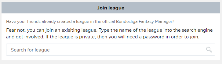 The Bundesliga Steem League has been created and can now be joined. What you first need to do is go to https://fantasy.bundesliga.com and register an account, then you go to the "My Leagues" tab and scroll down til you find this: