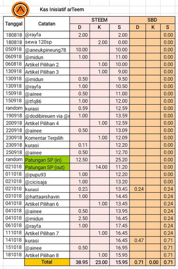 Total donasi yang telah dikumpulkan @arTeem sampai hari Minggu (21/10) adalah sebesar 26,45 STEEM. Total pengeluaran adalah 11,50 STEEM. Sehingga menyisakan sebanyak 14,95 STEEM di dalam kas.
