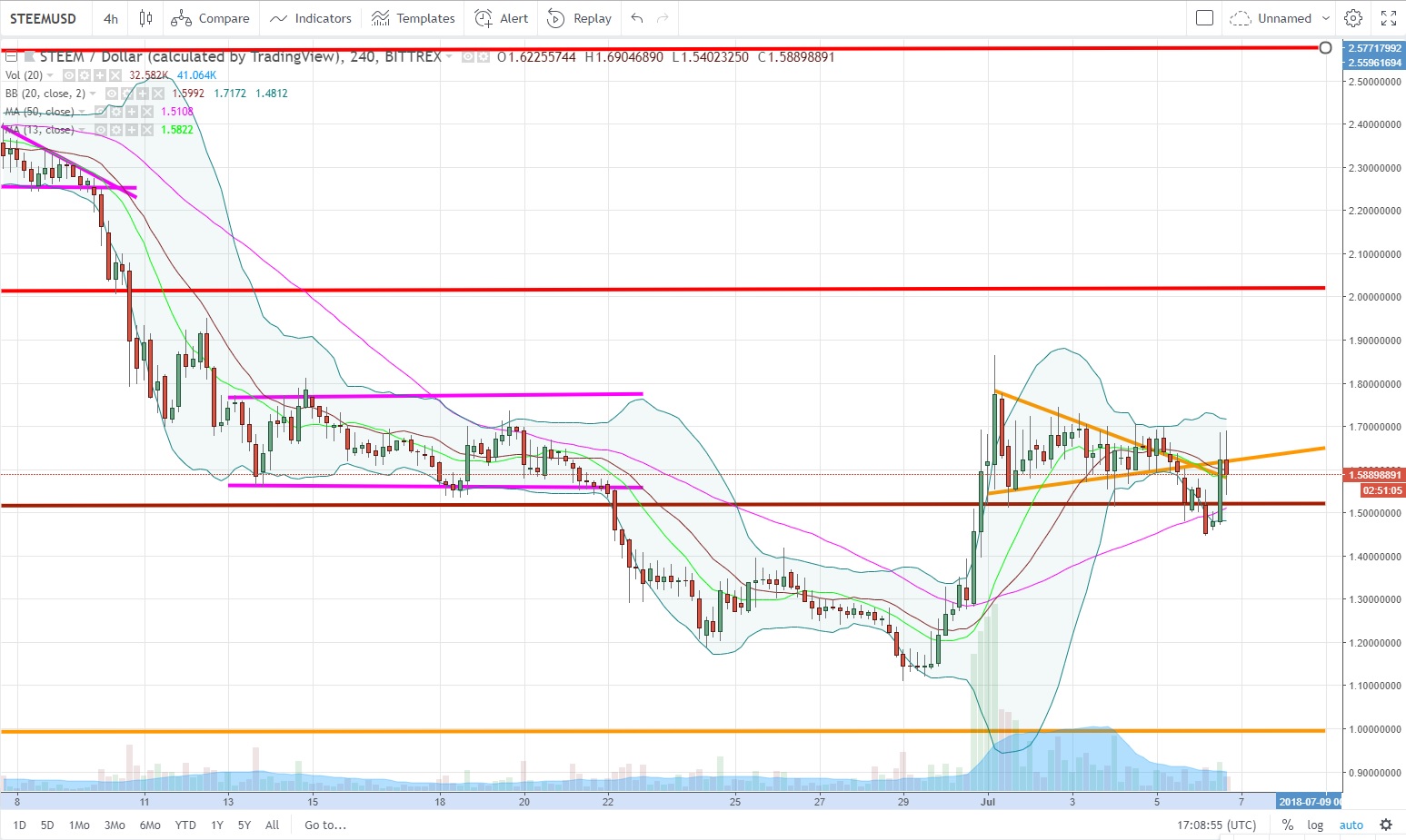 The resistance line created by the lower line of the triangle created a pull back which sent us directly on the support line at 1.50$ We are now testing it, going little lower, little upper. A break out should happen soon, let's just hope it will be a UP Break Out because if this is a DOWN Break Out, we will again go quickly in the direction of the 1$ level.