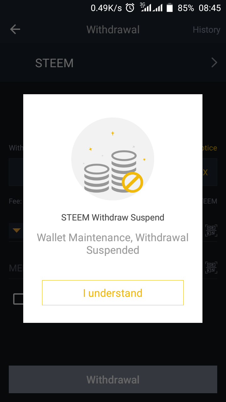 First I had to crack my Bitcoin cold wallet, that was already difficult enough because the 11 years old computer I use for offline keys storage didn’t want to work. But the real surprise came as I bought my Steem with my Bitcoin on my Binance account as in earlier cases. Withdrawals were suspended, due “wallet maintenance”, allegedly.