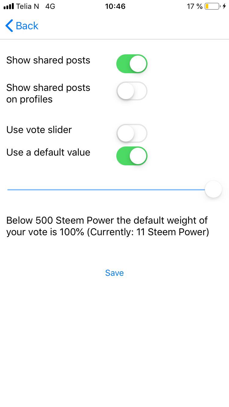 However, for those who please, you can choose to use a default weight for your votes (e.g. 25%) instead of using the dynamic vote slider. This setting can be set in the account settings of the app.