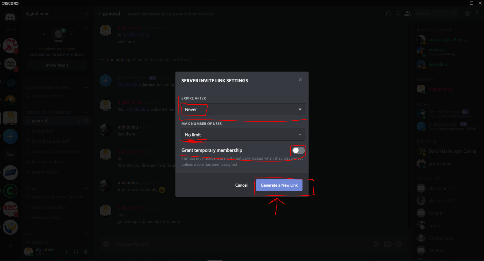 select NEVER under EXPIRE AFTER, and NO LIMITS under MAX NUMBER OF USERS, than click on generate link