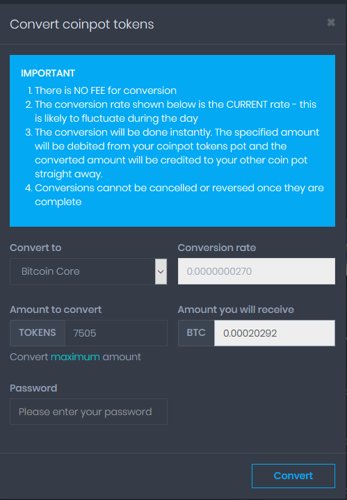You can convert any of the cryptocurrency that CoinPot is supporting in any one that you like. For example if i will exchange all my portfolio (COINPOT TOKENS, BCH, DASH, LTC, DOGE) in BTC i will have in this moment a bit over 50k satoshi.