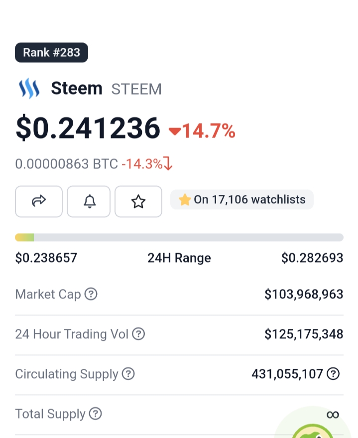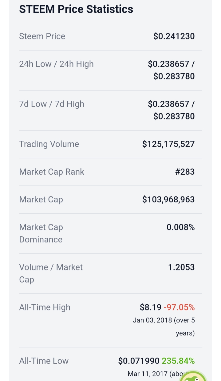 Today Steem price is $0.24 with a 24-hour trading volume of $125,175,348 USD. Steem is down -11.81% in the last 24 hours. The current market ranking is #283, with a live market cap of $103,968,963. It has a circulating supply of 430 Million STEEM coins and the max. supply is not available.