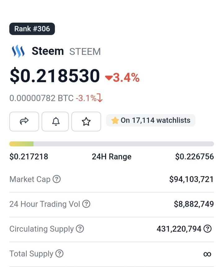 Today Steem price is $0.21 with a 24-hour trading volume of $8,862,585 USD. Steem is down -3.65% in the last 24 hours. The current market ranking is #306, with a live market cap of $94,064,107. It has a circulating supply of 430 Million STEEM coins and the max. supply is not available.