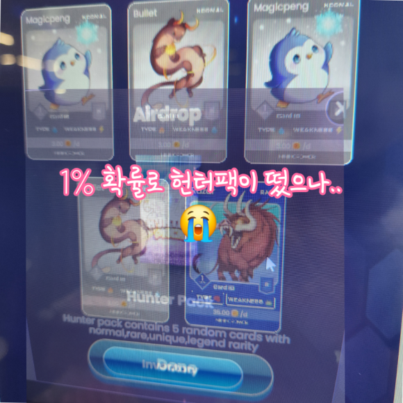 1%확률로 나오는 헌터팩이 나왔습니다 40 $steem의 가격이기 때문에 내심 기대했는데요 과연..!!