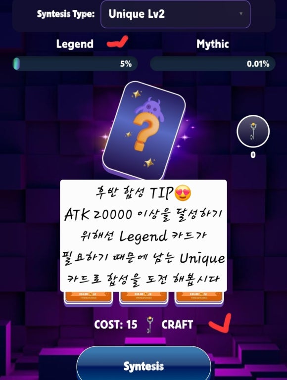 Rare등급의 카드 LV.2는 손쉽게 만들 수 있기 때문에 Unique 등급의 카드를 노려서