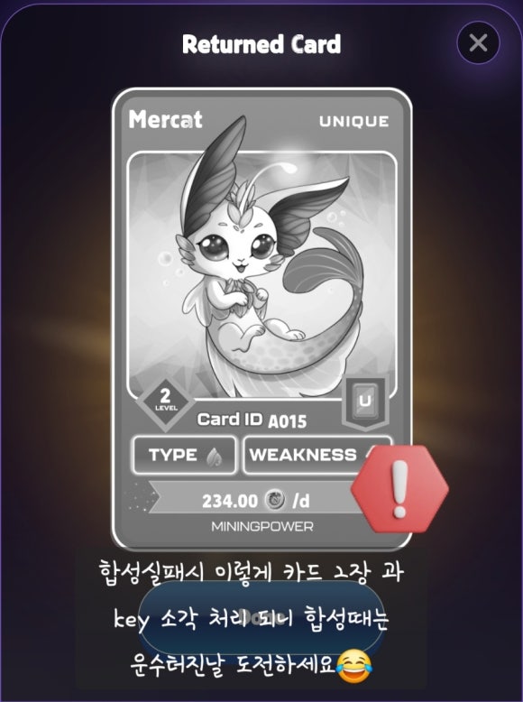 실패 하면 아래와 같이 카드 1장만 남고 나머지 2장 과 사용된 Key는 소각되니