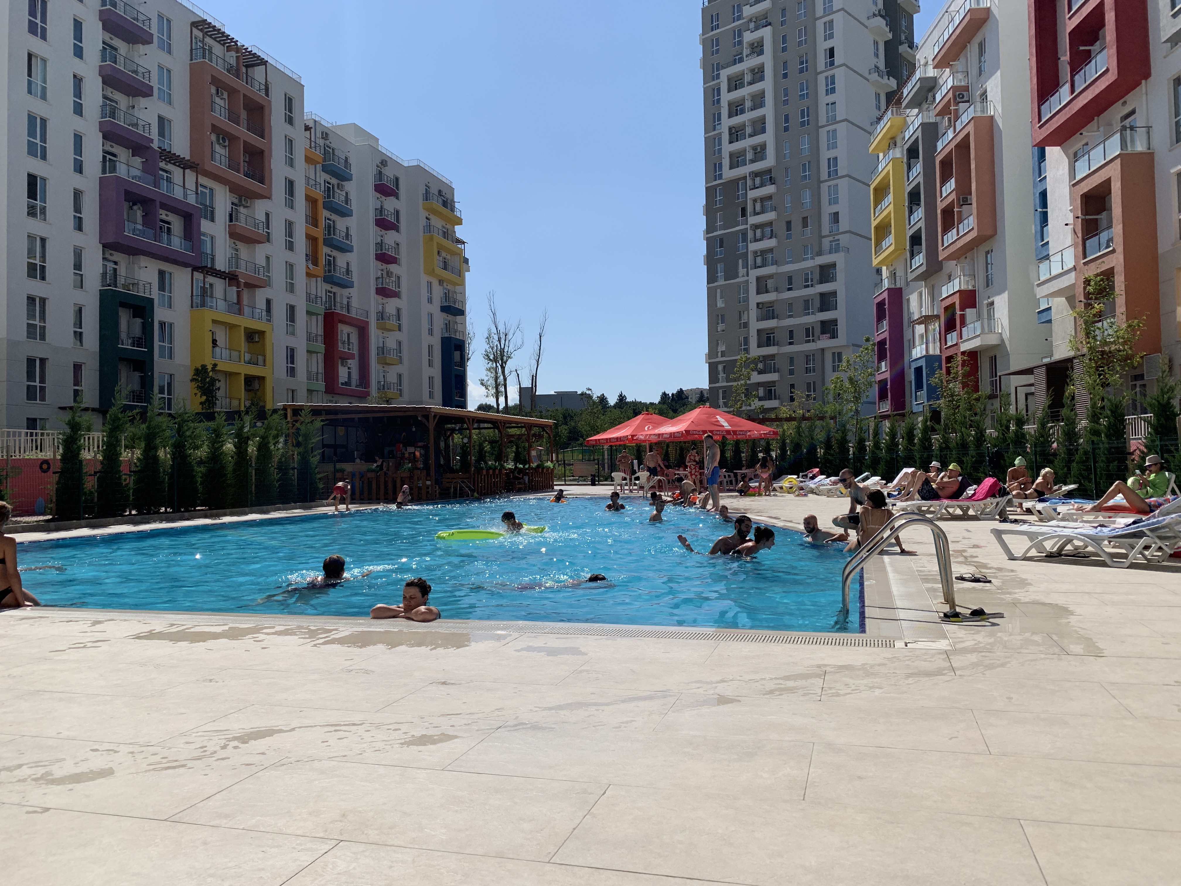 Что мы можем делать лето? Конечно же плавать. И наш жилой комплекс как раз для этого походит и много людей живут тут и плавают в бассейне
