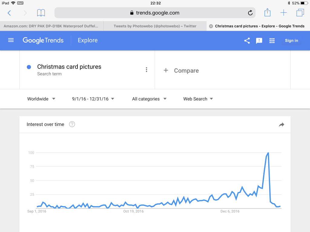 Head over to Google Trends, put in a search term, such as Christmas card photos specify a date range1, and see what it tells you.