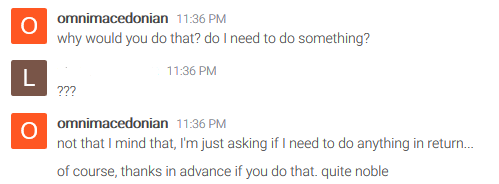 I tried to make him explain why the 1 SBD (I couldn't get to a straight answer), while at the same time checking his transfer history, and he's making, what seemed to me, a ton of transactions at the moment of our conversation. Somehow this made me believe he is legit, and that he'd help out sometimes. Of course, I never took the amount literally, but I've been playing around with some of those upvoting bots and thought this could work in a similar fashion, a little boost can't hurt.