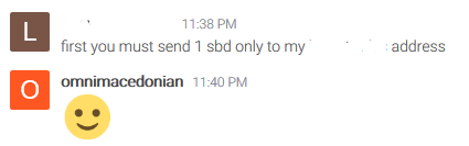 I'm not quite sure why I kept the conversation going. This stank like a scam, besides, I need to send 1 SBD to this guy's account so he can later upvote my stuff. Seems like a lottery, with the difference that someone guarantees that you'll win. It's clearly a scam.