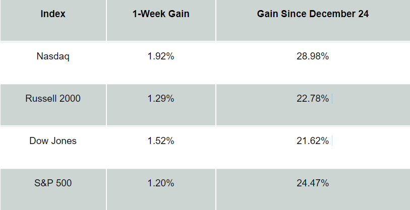 Growth led the way with the biggest gains this week. You can see that in the table below, with the tech-heavy Nasdaq outpacing the other indexes…