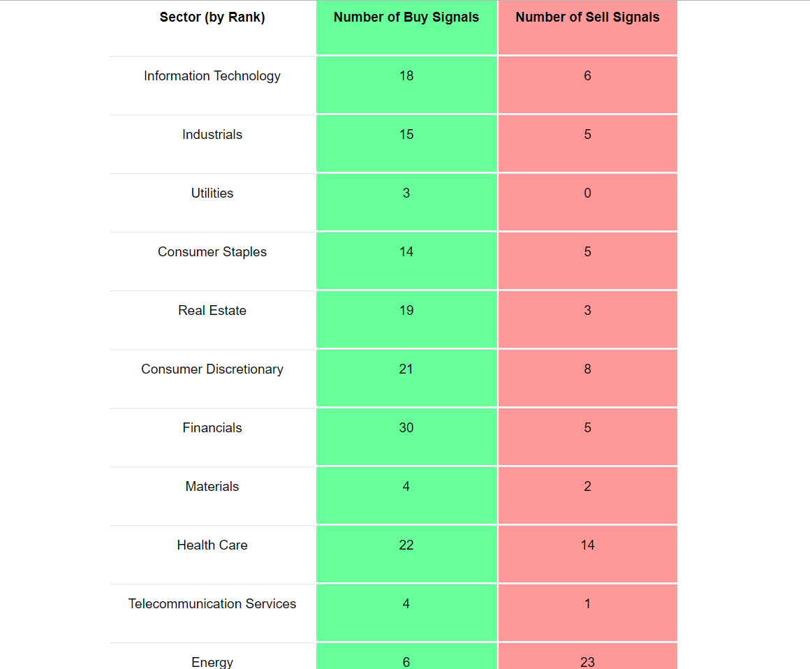 And the next table below ranks the market sectors based on my system’s criteria—including buy and sell signals. In other words, it shows what the smart money is likely buying and selling each week.