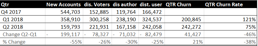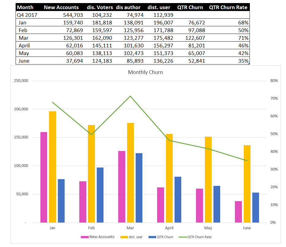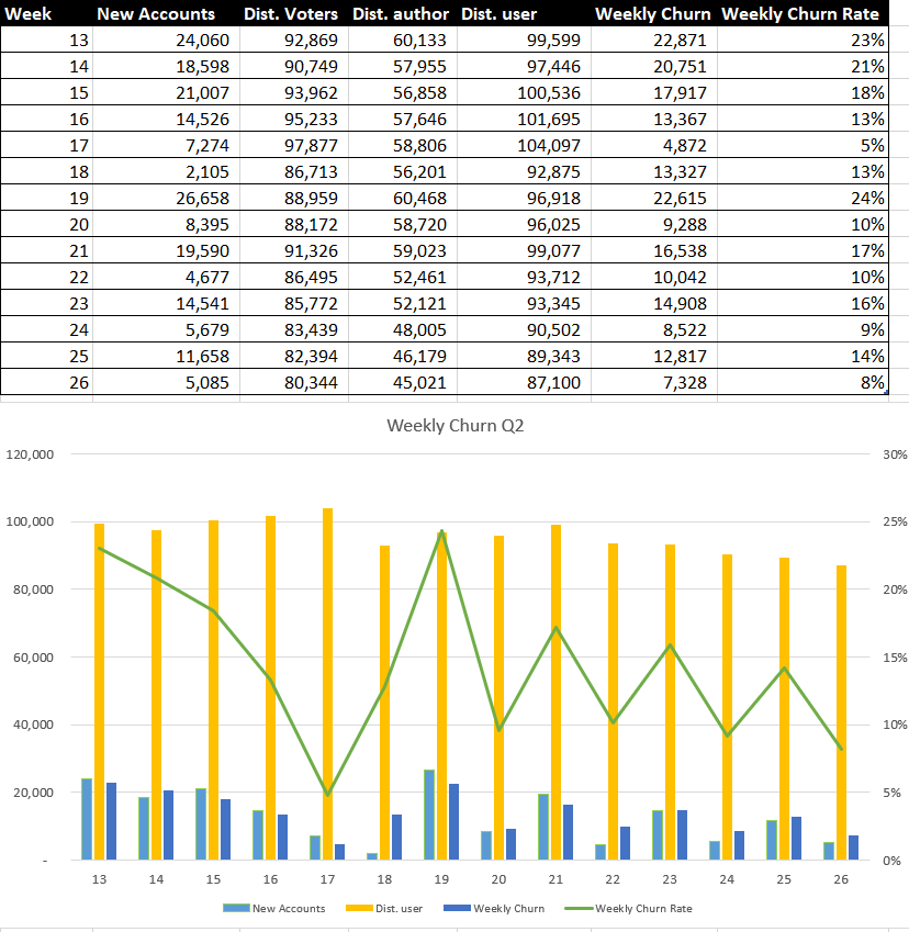 The table above shows the number of new accounts registered per week, the distinct count of votes, the discount of authors, the distinct user count (either voted or posted/commented), the weekly churn and the weekly churn rate.