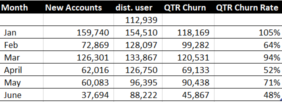 As with the weekly churn rates you would expect to see a variance on the monthly churn rates as the variable also change. the number of new accounts registered each month droped considerably from Jan to June(76%). However the distinct user is smoother when looked at monthly over weekly and from Jan to June has only reduced by 30%. On a monthly basis this has resulted in a churn rate drop from 68% in Jan to 35% in June.