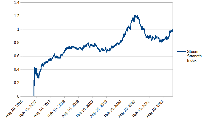 Also, here's a graph of a toy metric that I made up to compare BTC and STEEM, based on their day to day direction of movement (up or down). Basically, "1" means that they have had similar performance over the last year; above 1 means that STEEM had more up days, and below 1 means that BTC had more up days. For almost all of STEEM's lifespan, it has underperformed in comparison to BTC. The only times that STEEM has scored at 1 or above are from April 23 to December 8 in 2020, and today.