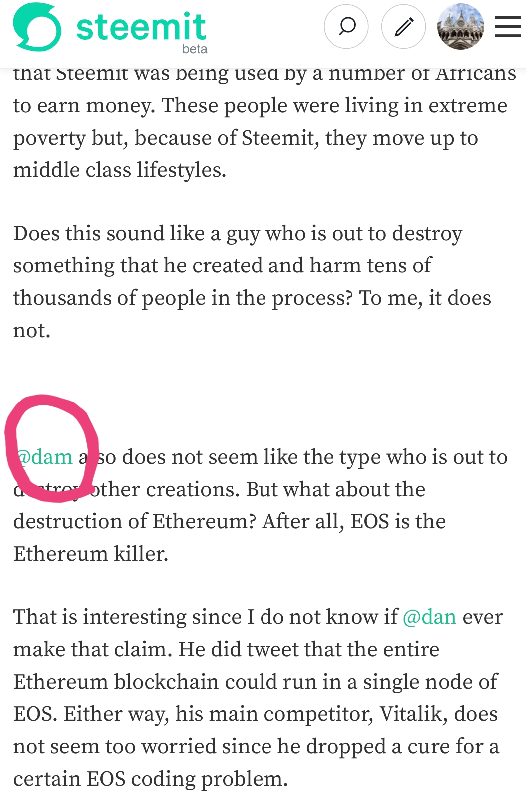 @dan also does not seem like the type who is out to destroy other creations. But what about the destruction of Ethereum? After all, EOS is the Ethereum killer.