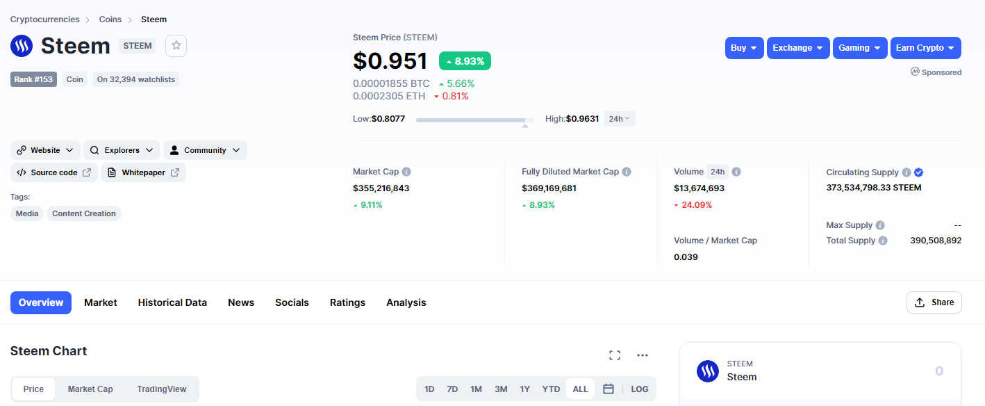(Source: https://coinmarketcap.com/currencies/steem/)