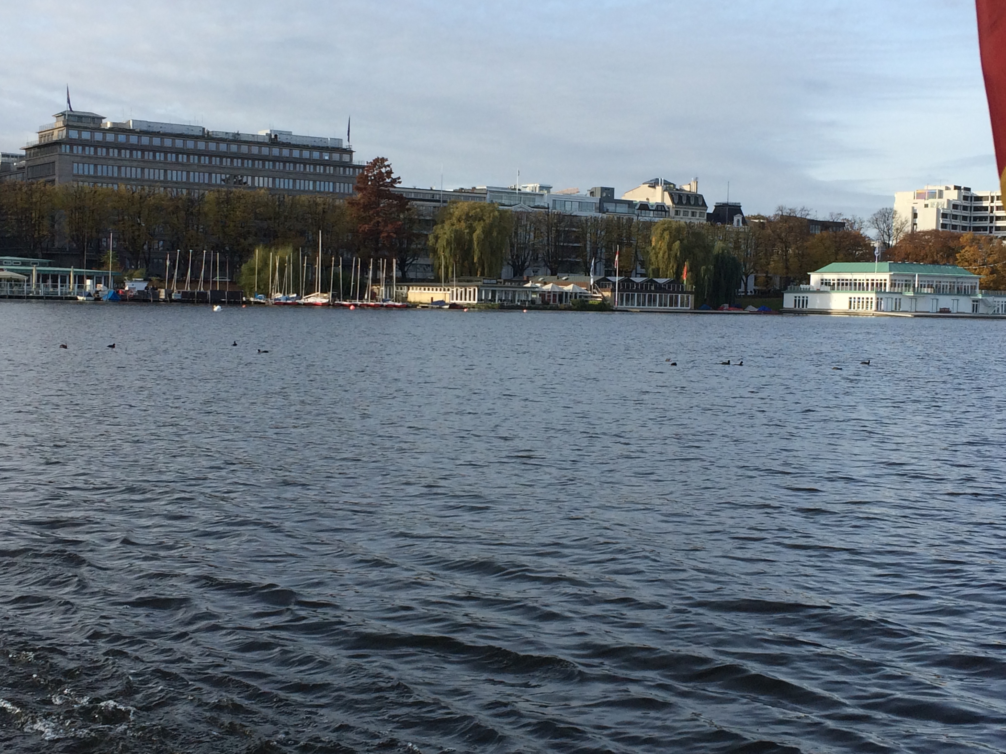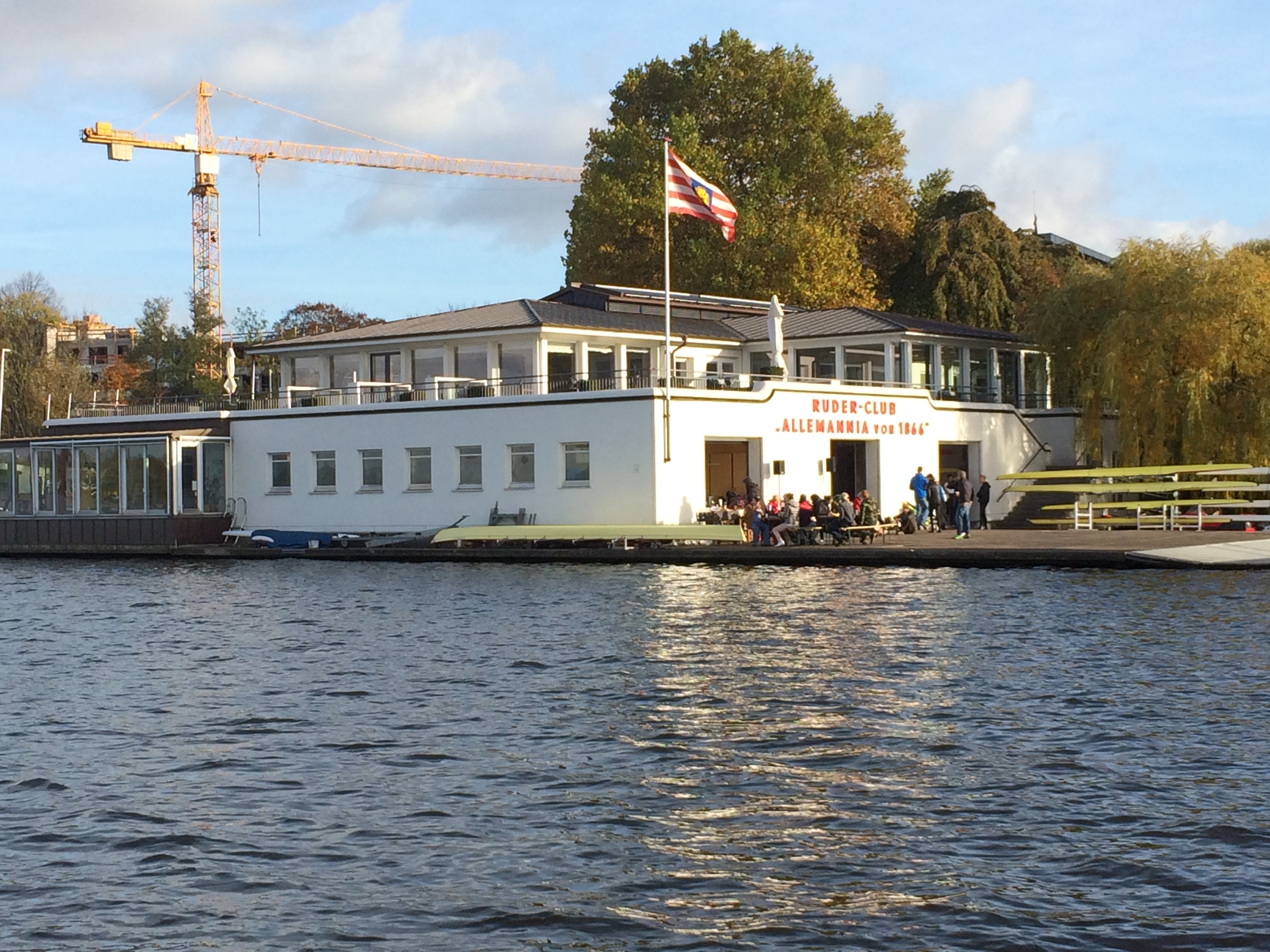 After the exit of the Binnenalster to the Außenalster you can see the two rowing clubs Favorite Hammonia and Hamburger and Germania Ruder Club on the left side.