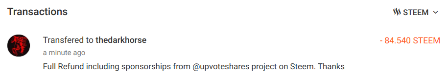 I refunded all your shares @thedarkhorse (31.08 Steem) including the ones you sponsored to @pifc (33.36 Steem), @wolfhart (6.70 Steem), @tryskele (6.70 Steem), & @lynncoyle1 (6.70 Steem) This added up to 84.54 Steem in total. Thanks
