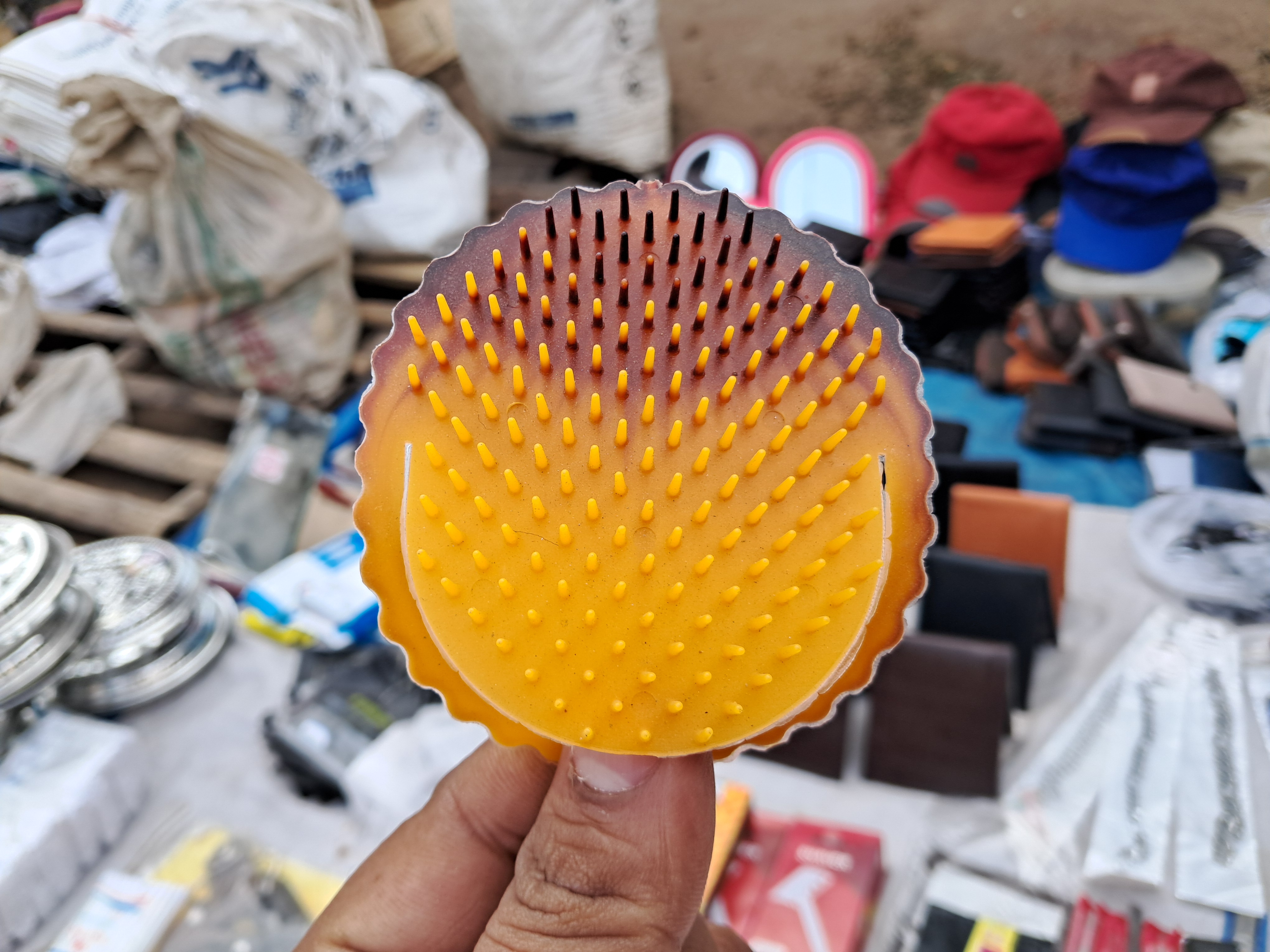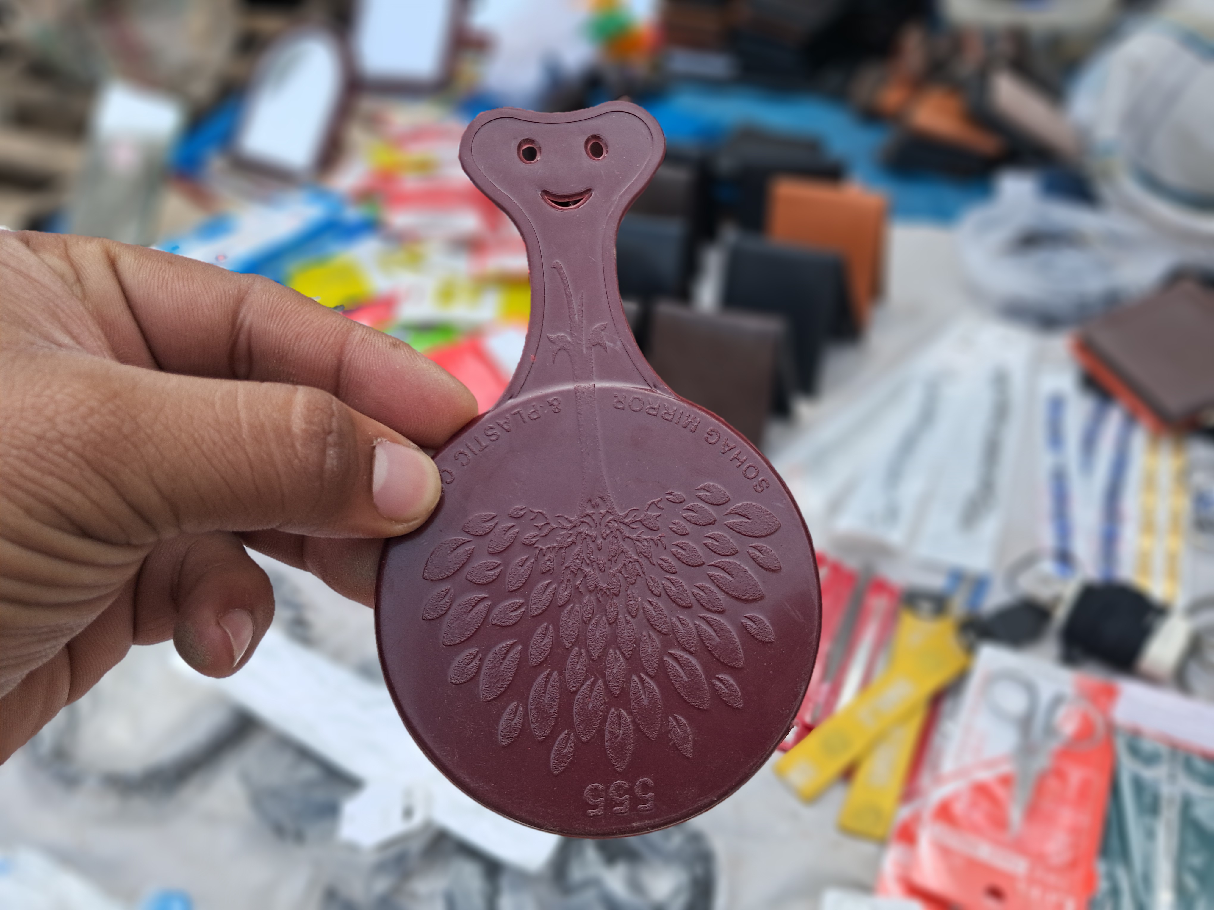 There I saw combs for men's hair care. The style of the combs is a little round, but they have rubber handles to hold them. There are small mirrors that look very nice and have handles to hold them at the bottom. The small mirrors are made of plastic.