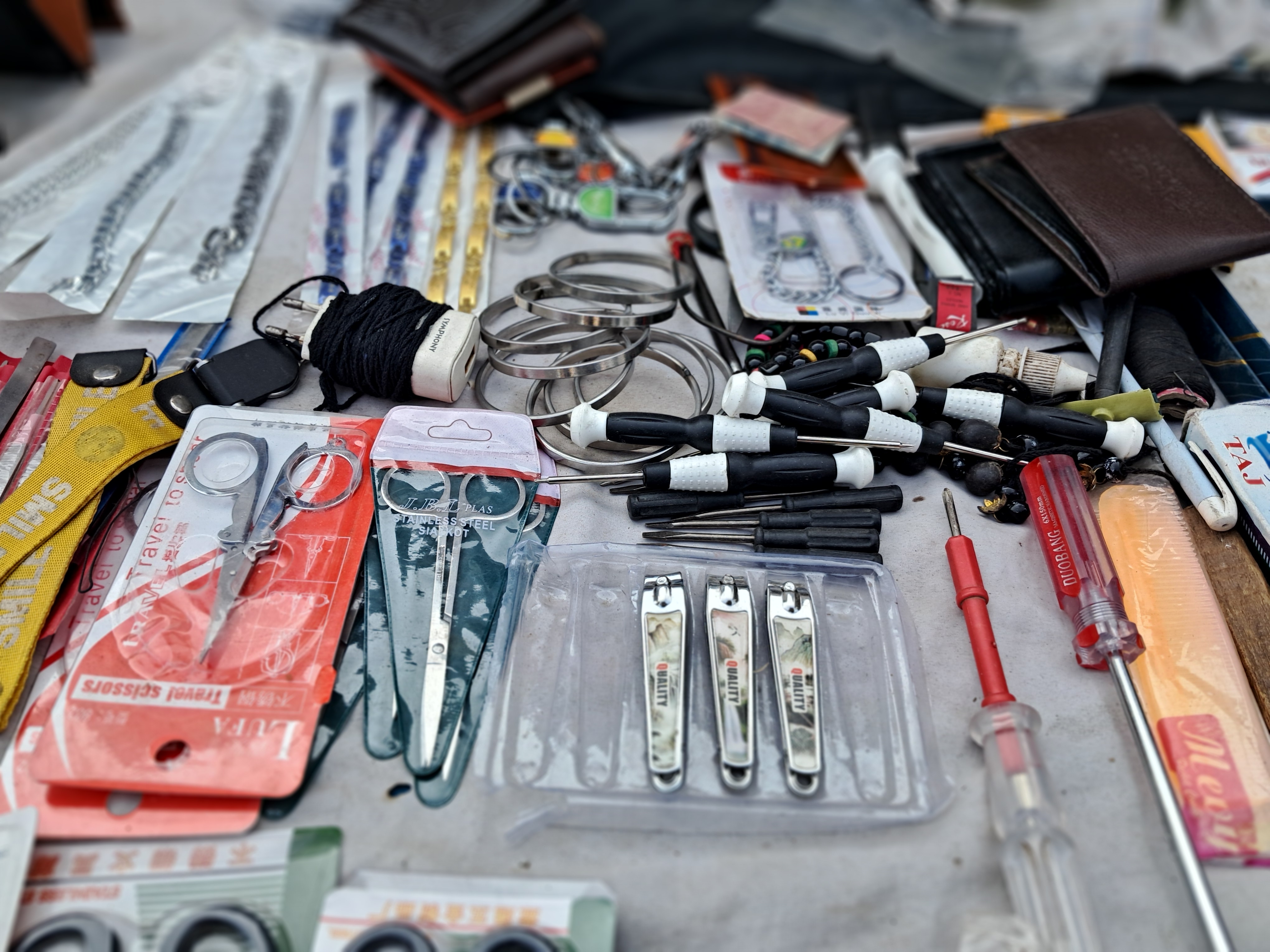 Apart from small cosmetic products, you will also find other useful products that are used in your daily work. There you will find small screwdrivers. Here you will find small medical scissors and knives. Here you will find some children's items, including threads for children's necks and wrists.