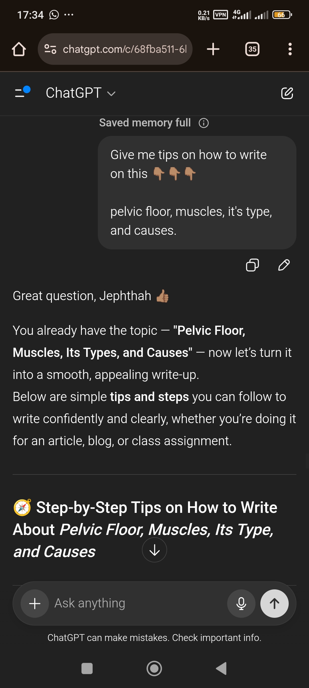 | You ask Ai the question telling it to simplify and make you understand. It should also include illustrations and applications to help you understand what pelvic floor is. After Ai has given you what an explanation, you then read through and they to rewrite in a way you'll understand. This is what Ai gave me | The pelvic floor is a group of muscles, ligaments, and connective tissues located at the base of your pelvis — that’s the area between your hip bones. Imagine the bottom of your pelvis (your hip area) as a bowl or basket that holds your internal organs — your bladder, uterus (for women), prostate (for men), and rectum. The pelvic floor muscles form the bottom part of that bowl, acting like a stretchy, supportive net or a trampoline that keeps everything inside your abdomen from dropping downward. |
