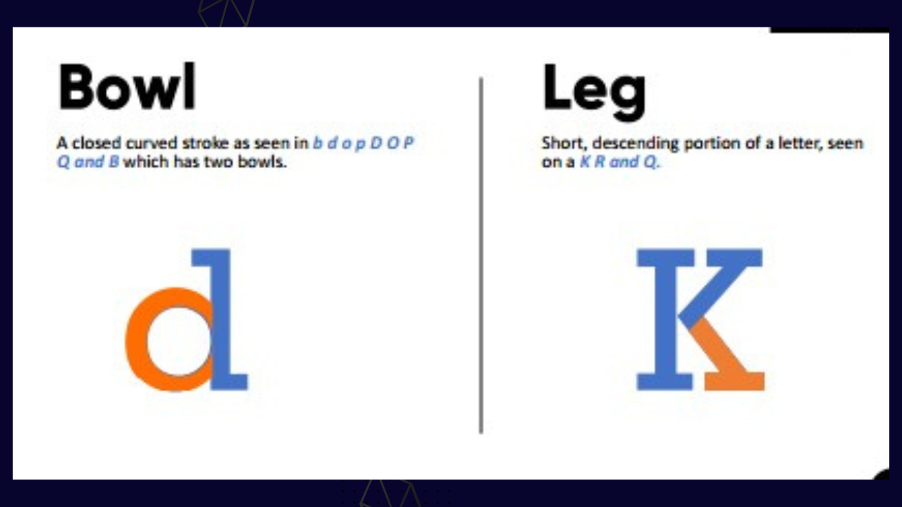 Bowl: this is used to describe letters with closed curved strokes just as seen in "b", "o" , "P", "Q" "B"