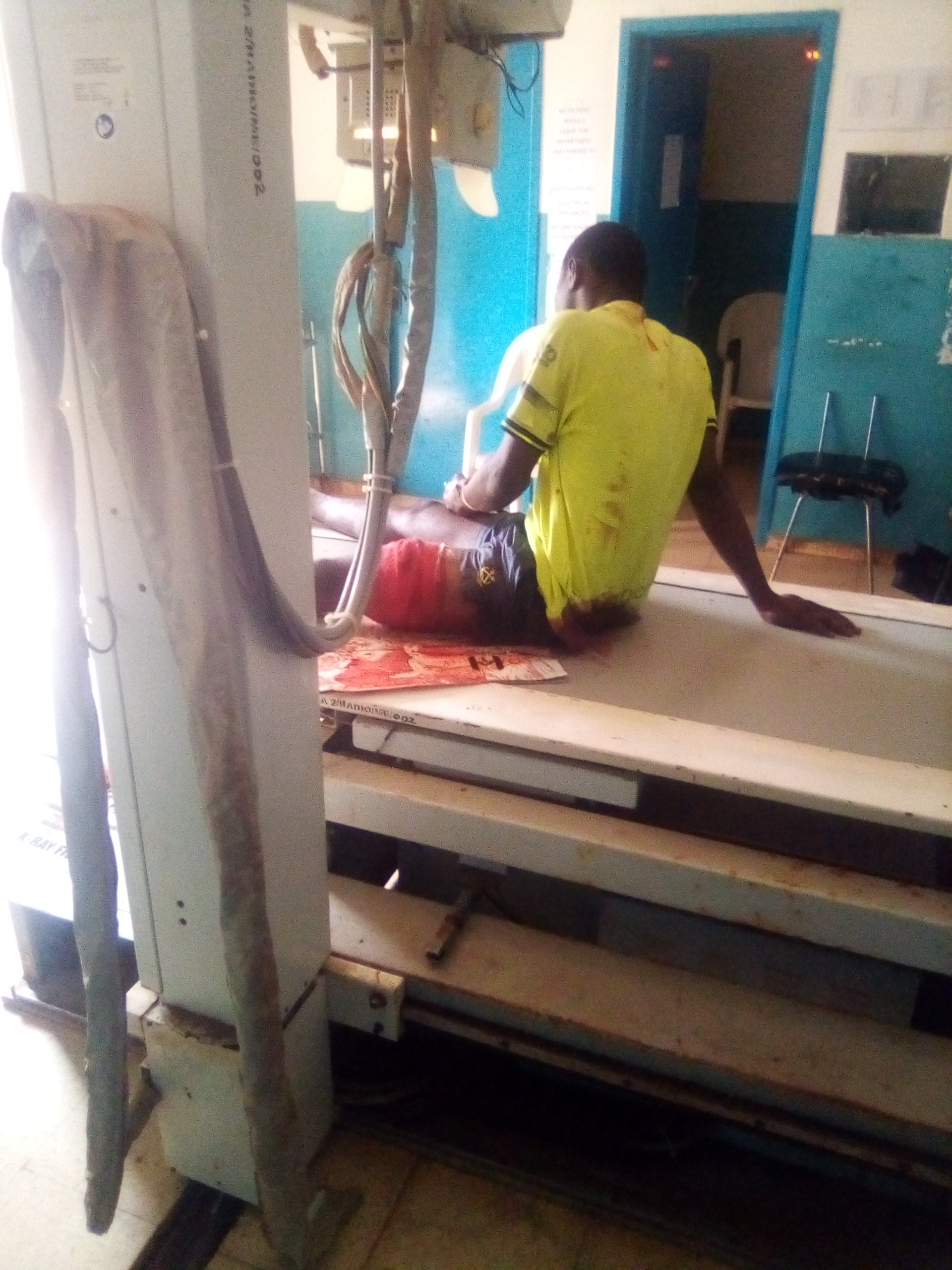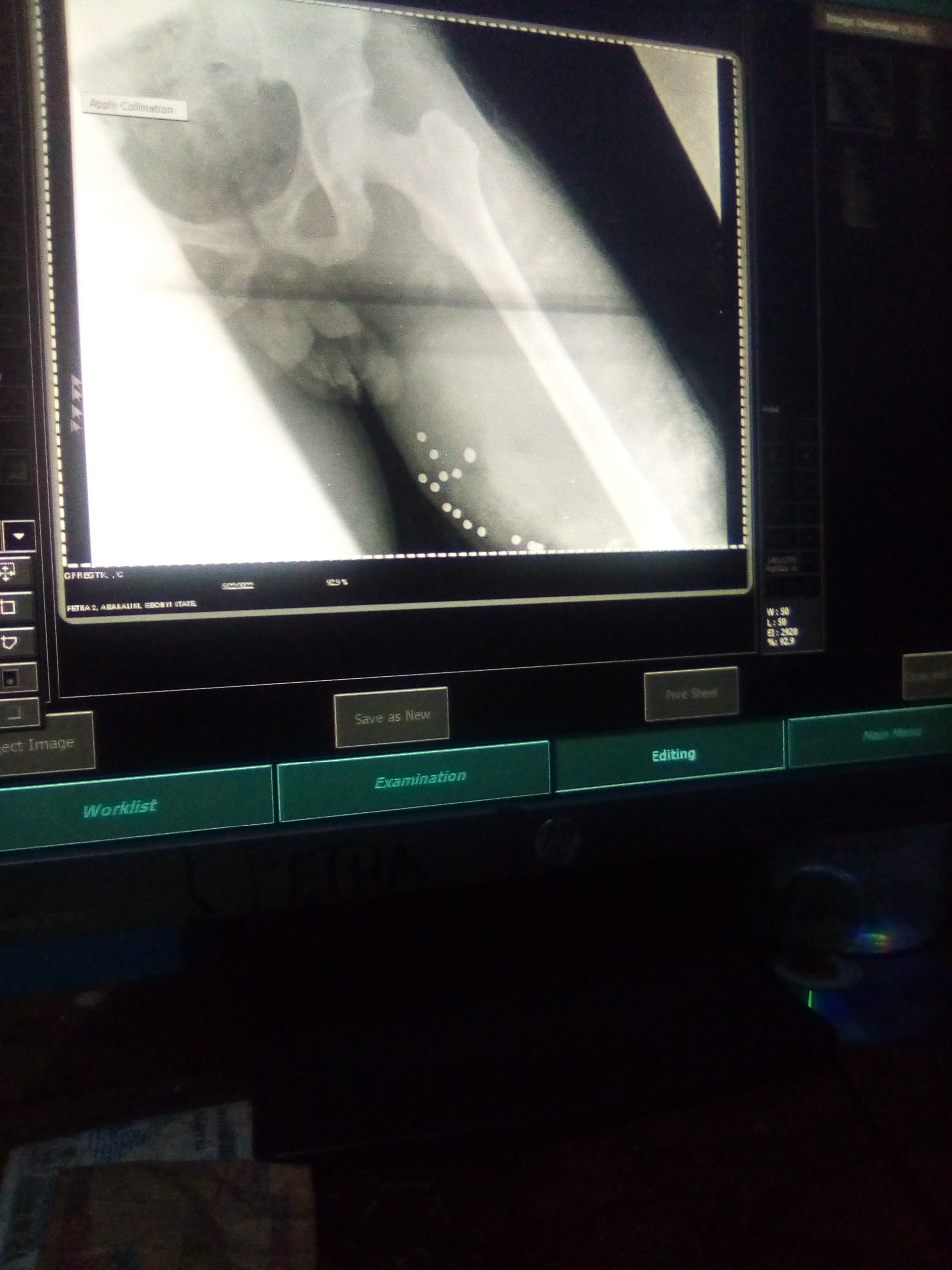 That was an examination carry-out for a patient that had gun shut injury on the femur, that was on Sunday when i was on call duty. The patient was bleeding, profusely, an he was in pain, he had lost a lot of blood, so care need to be taken to minimize pain.