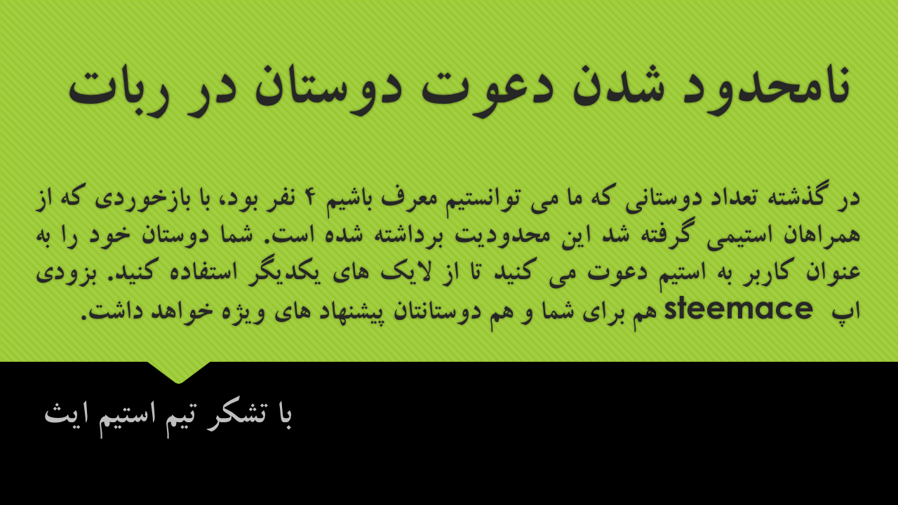 در گذشته تعداد دوستانی که ما می توانستیم معرف باشیم 4 نفر بود، با بازخوردی که از همراهان استیمی گرفته شد این محدودیت برداشته شده است. شما دوستان خود را به عنوان کاربر به استیم دعوت می کنید تا از لایک های یکدیگر استفاده کنید. بزودی اپ steemace هم برای شما و هم دوستانتان پیشنهاد های ویژه خواهد داشت.
