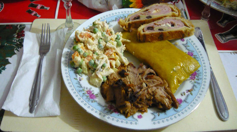 The typical Christmas dish in Venezuela is the hallaca. It is prepared with corn flour and stuffed with a pork stew, meat and chicken. This stew is seasoned with onion, pepper, sweet pepper, leeks, capers, salt, English sauce and potato. The dough is spread on a banana leaf and olives and grapes are placed in the middle of the hallaca.