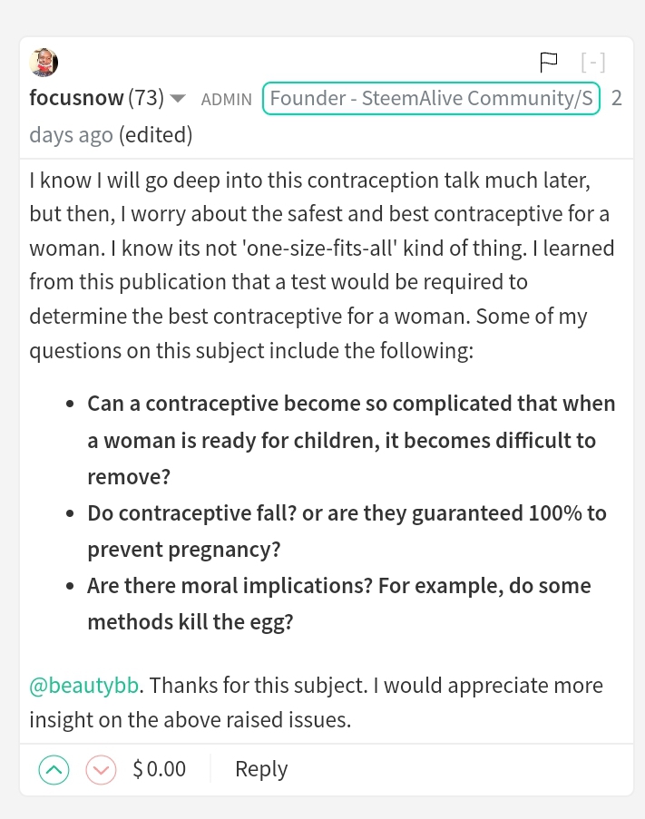 Hello ma @beautybb it's a good thing to know about the contraceptives although am not a woman but I have learnt so many things because tomorrow I will get married and life goes on..