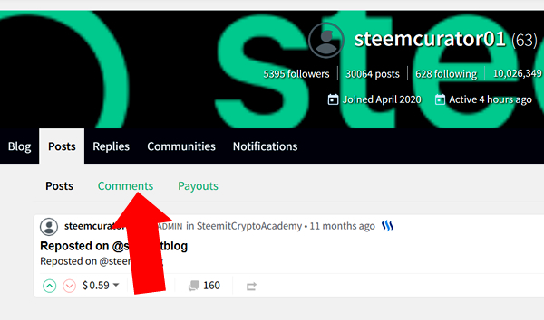 Method 2: You can just go straight to the comment page by clicking this link: https://steemit.com/@steemcurator01/comments