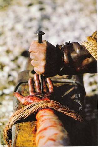 A hammer driving large nails through the wrist, the feet overlapped and an even large nail hammered through the arches, then a