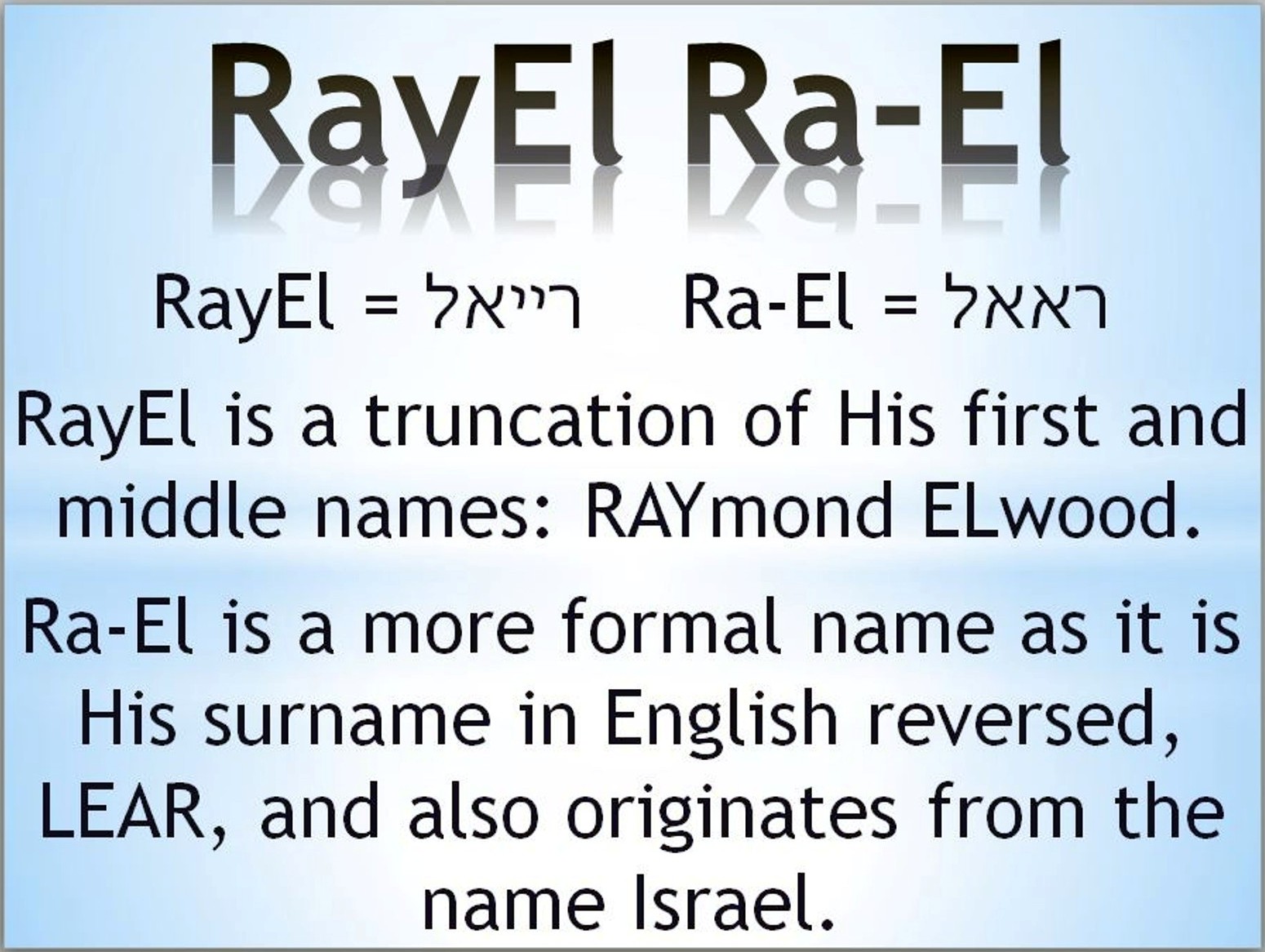 The etymological origin of the name Ra-El (RayEl), is traceable back to Egyptian Judaism. RayEl literally means "Word of God". Further, if you read Revelation 19:13, it clearly tells you that "his name is the Word of God", so "RayEl" is the name the Bible told you he would have.