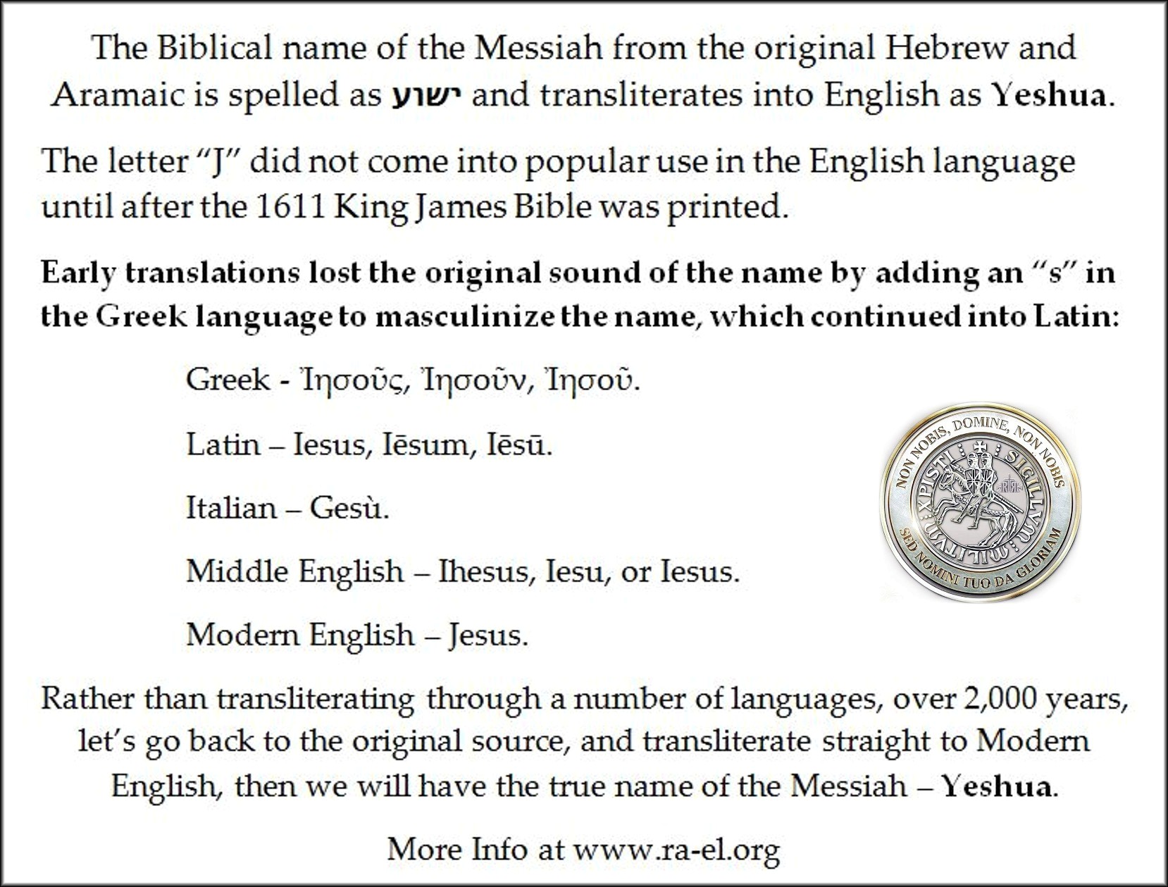 His name cannot be Jesus (that false name created by the Vatican has only been in existence for 400 years) nor does he use his original name of Yeshua ישוע on his return.