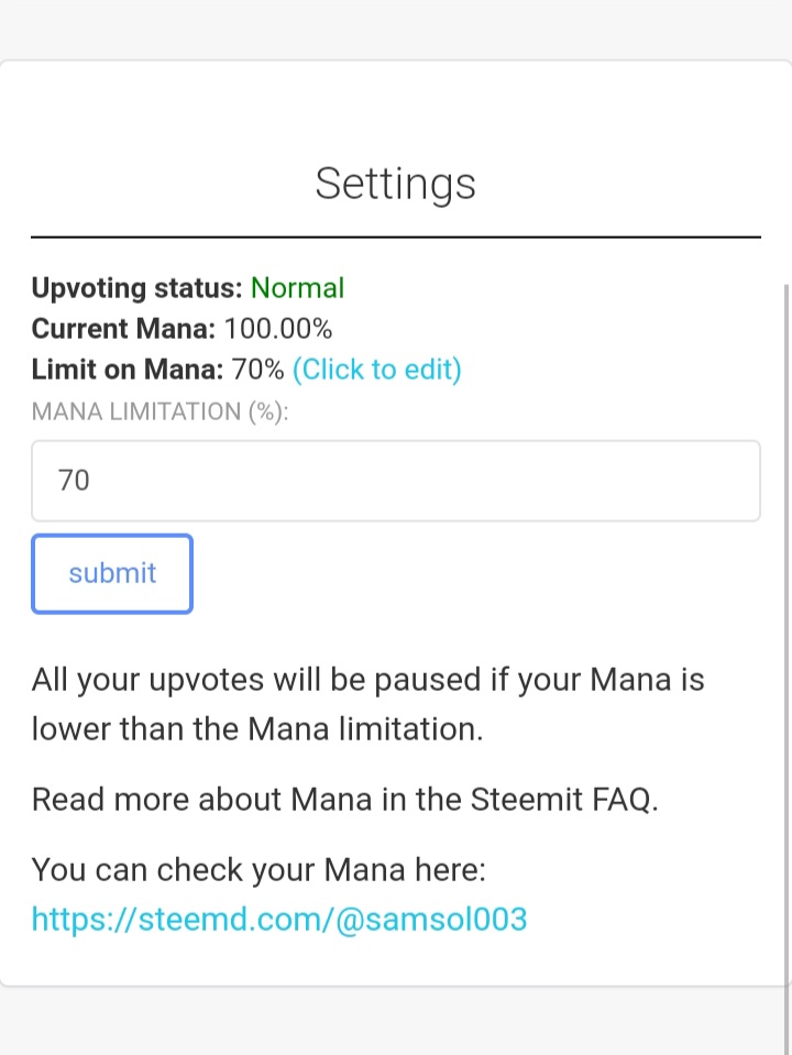 2. On the home page, in the "settings" tab, you have to set which one. mana limit is set to 70-80%. This is you according to your voting rights. What this means is, if your mana drops below that level, your upvote will automatically be stopped along with the curation trail.