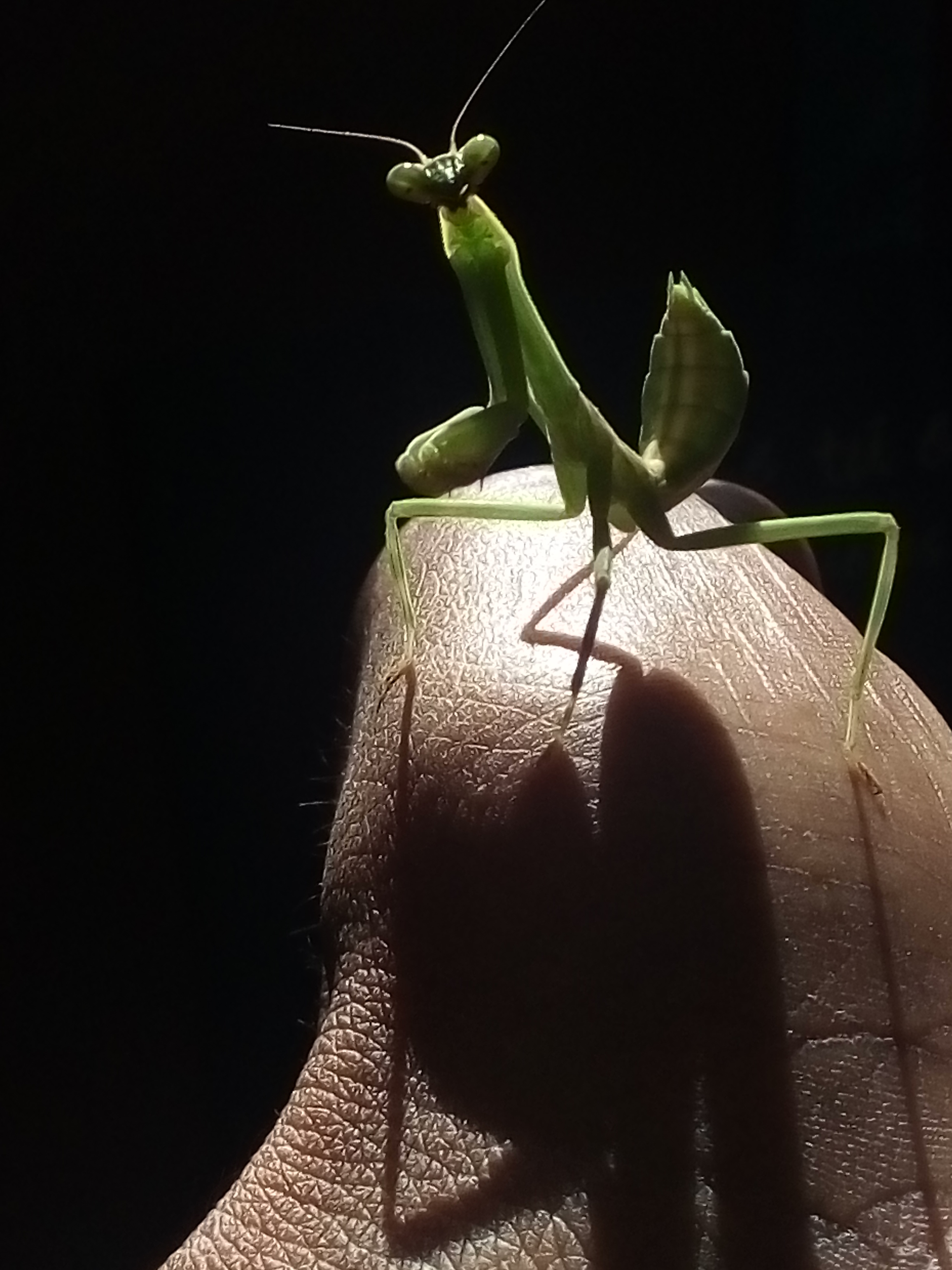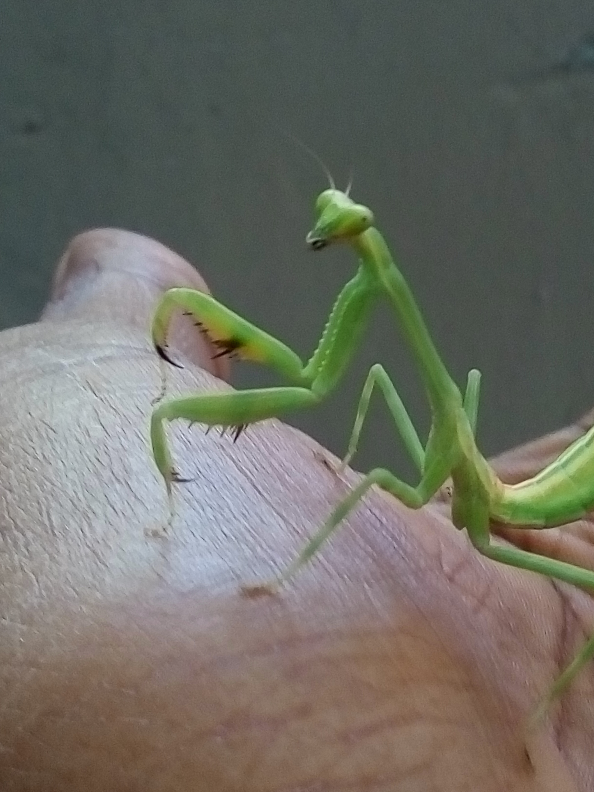 Hola a todos que tal buenas tardes comunidad steemit, en esta ocasion deseo compartiles estas fotos tomadas esta mañana de un pequeño ser que de por si no es dañino para el ser humano, lo es para los insectos de su entorno. Resulta que estaba arreglandole las plantas a mi mama y en una de ellas me tope con esta pequeña belleza, una mantis religiosa la cual al parecer lo me tuvo miedo alguno jajaja ya que en vez de salir huyendo se quedo morandome fijamente.