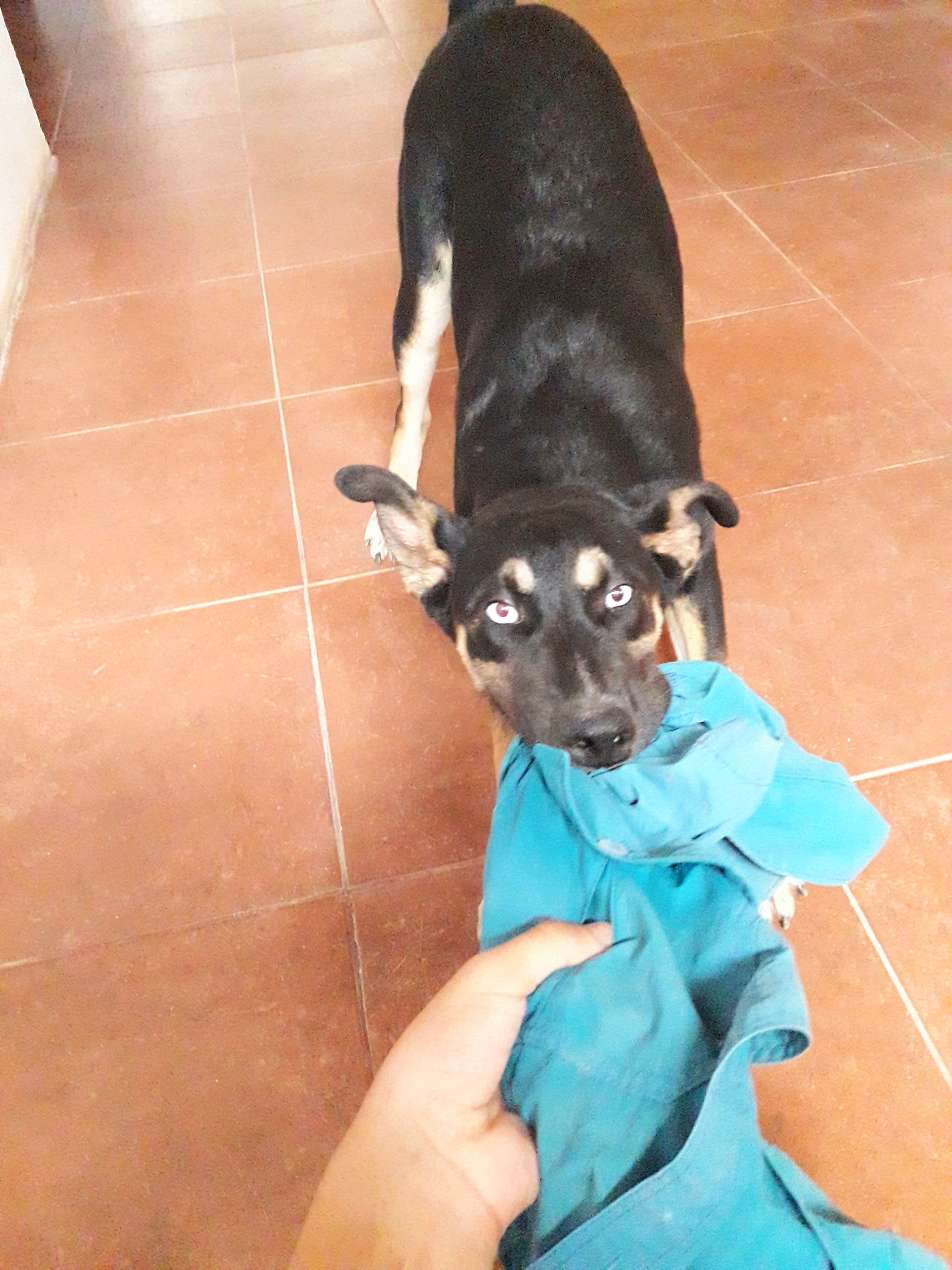Le encanta hacer desastre cuando mí mamá y yo dejamos qué pasé a la casa es muy traviesa, le gusta mucho jugar con camisas viejas y palitos yo sé los lanzo, ella los busca y me lo entrega de nuevo para qué lo vuelva a lanzar y así sucesivamente, es muy atenta con los sonidos apenas escucha algo sube sus orejitas sé ve muy linda cuando hace eso.