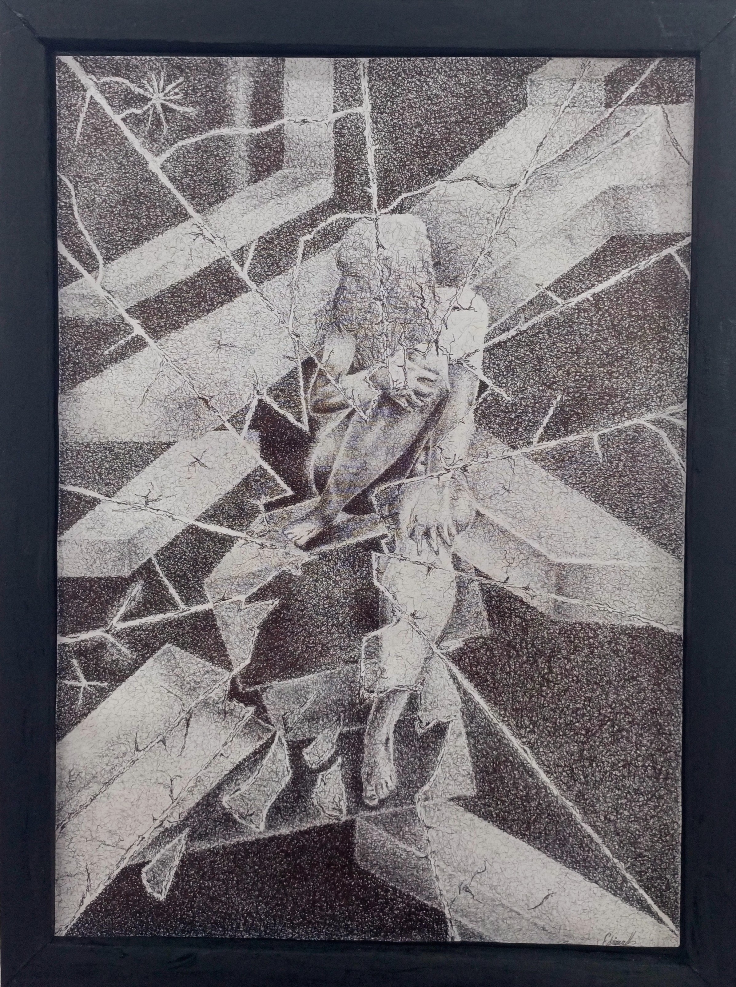 This is a captivating work made with ink, specifically a pen, using the scribbling technique to give life to a deep and suggestive visual narrative. In this piece, you can see the figure of a woman who is trapped in a context of fragility and intimacy, surrounded by broken mirrors and geometric elements.