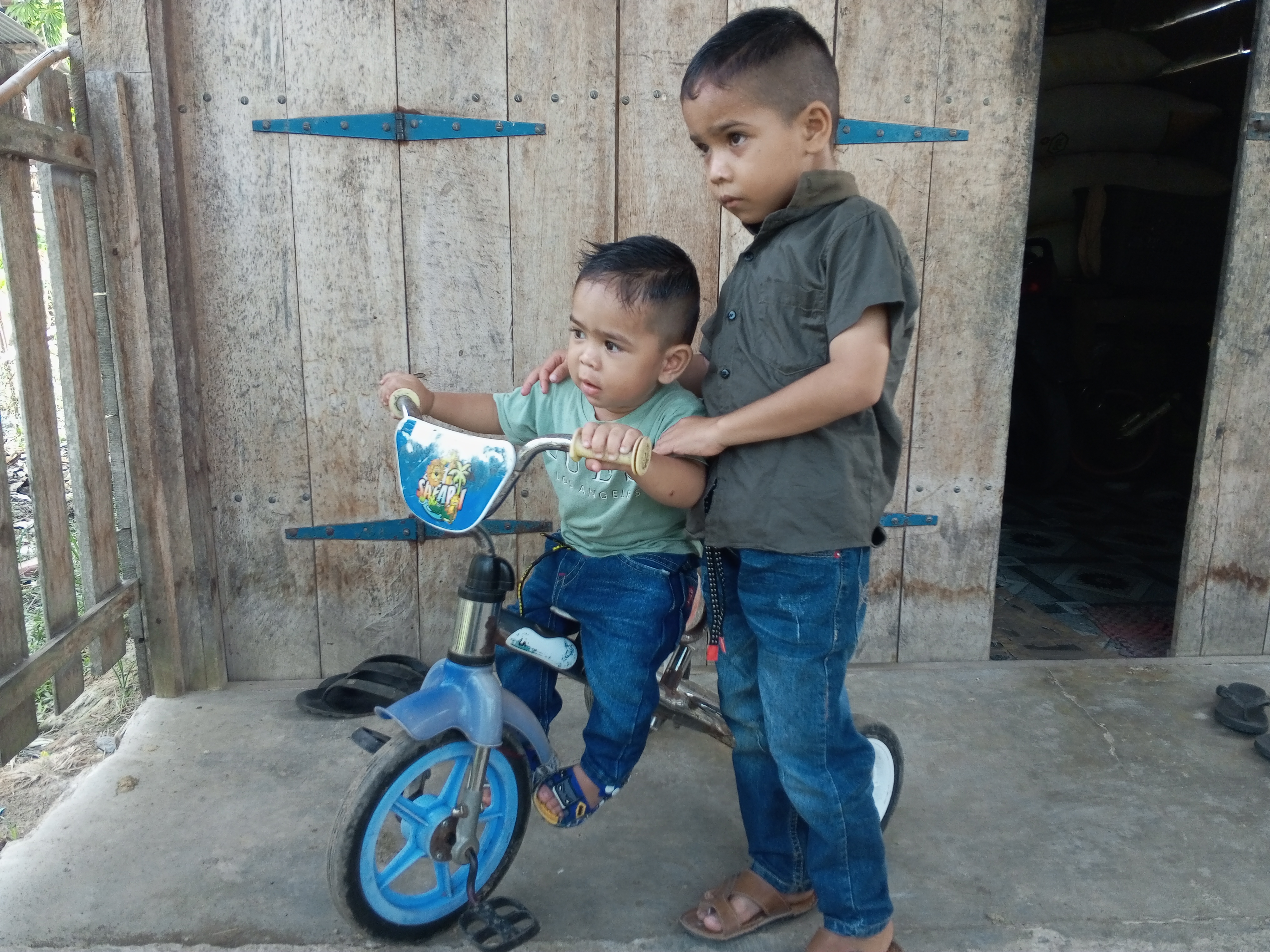 Si-kecil kami terlihat tampan apa lagi asyik bermain sepeda walau terkadang dayungan ia belum akurat yang membuat ia semakin ceria dengan apa yang ia dapatkan dari permainannya. Dan tak lama siabang datang mengusik dan ingin bermain bersama adiknya. Kedua putra kami mempunyai ikatan yang kuat mendukung satu sama lain dalam permainan. Dan siabang ingin mendapatkan kebagian dari permainan adiknya. Saya melihat siabang rayuan bujuk untuk mendapatkan simpati adiknya, namun sikecil tidak ingin berbagi sehingga tetap menjaga milikinya.