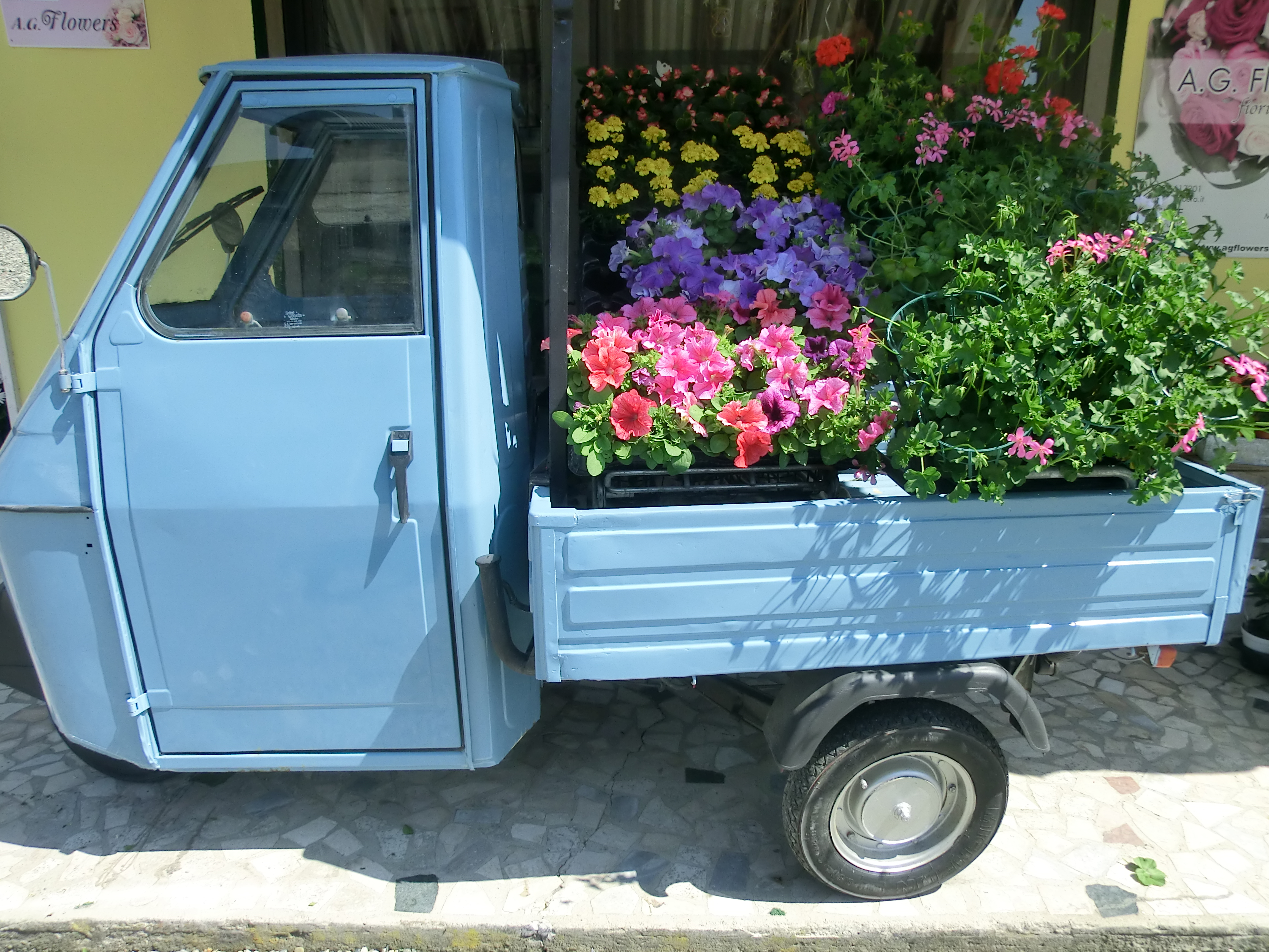 The owner of the shop came up with an original advertising ploy. She took her old car, which can still be found on the mountain roads of Italy, painted it and put it next to her flower shop.
